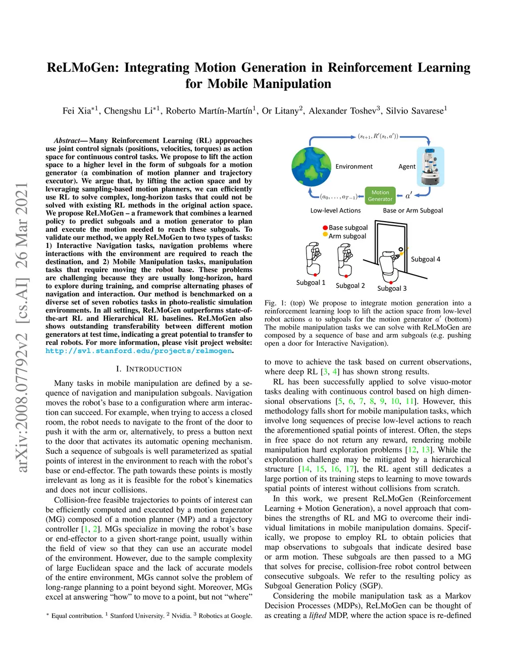 Many Reinforcement Learning (RL) approaches use joint control signals (positions, velocities, torques) as action space for continuous control tasks. We propose to lift the action space to a higher level in the form of subgoals for a motion generator (a combination of motion planner and trajectory executor). We argue that, by lifting the action space and by leveraging sampling-based motion planners, we can efficiently use RL to solve complex, long-horizon tasks that could not be solved with existing RL methods in the original action space. We propose ReLMoGen -- a framework that combines a learned policy to predict subgoals and a motion generator to plan and execute the motion needed to reach these subgoals. To validate our method, we apply ReLMoGen to two types of tasks: 1) Interactive Navigation tasks, navigation problems where interactions with the environment are required to reach the destination, and 2) Mobile Manipulation tasks, manipulation tasks that require moving the robot base. These problems are challenging because they are usually long-horizon, hard to explore during training, and comprise alternating phases of navigation and interaction. Our method is benchmarked on a diverse set of seven robotics tasks in photo-realistic simulation environments. In all settings, ReLMoGen outperforms state-of-the-art Reinforcement Learning and Hierarchical Reinforcement Learning baselines. ReLMoGen also shows outstanding transferability between different motion generators at test time, indicating a great potential to transfer to real robots.