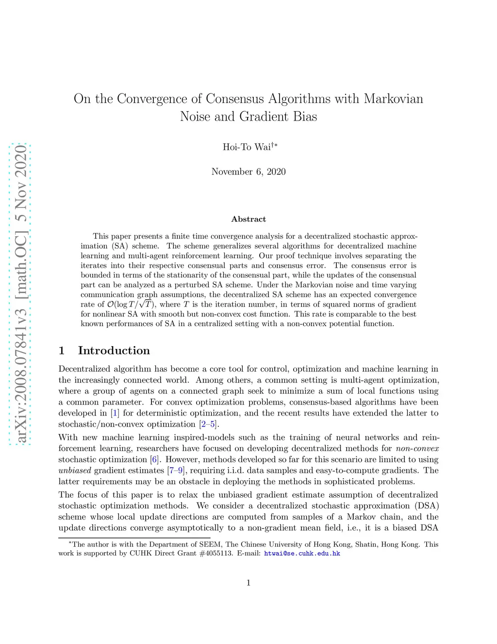 On the Convergence of Consensus Algorithms with Markovian Noise and