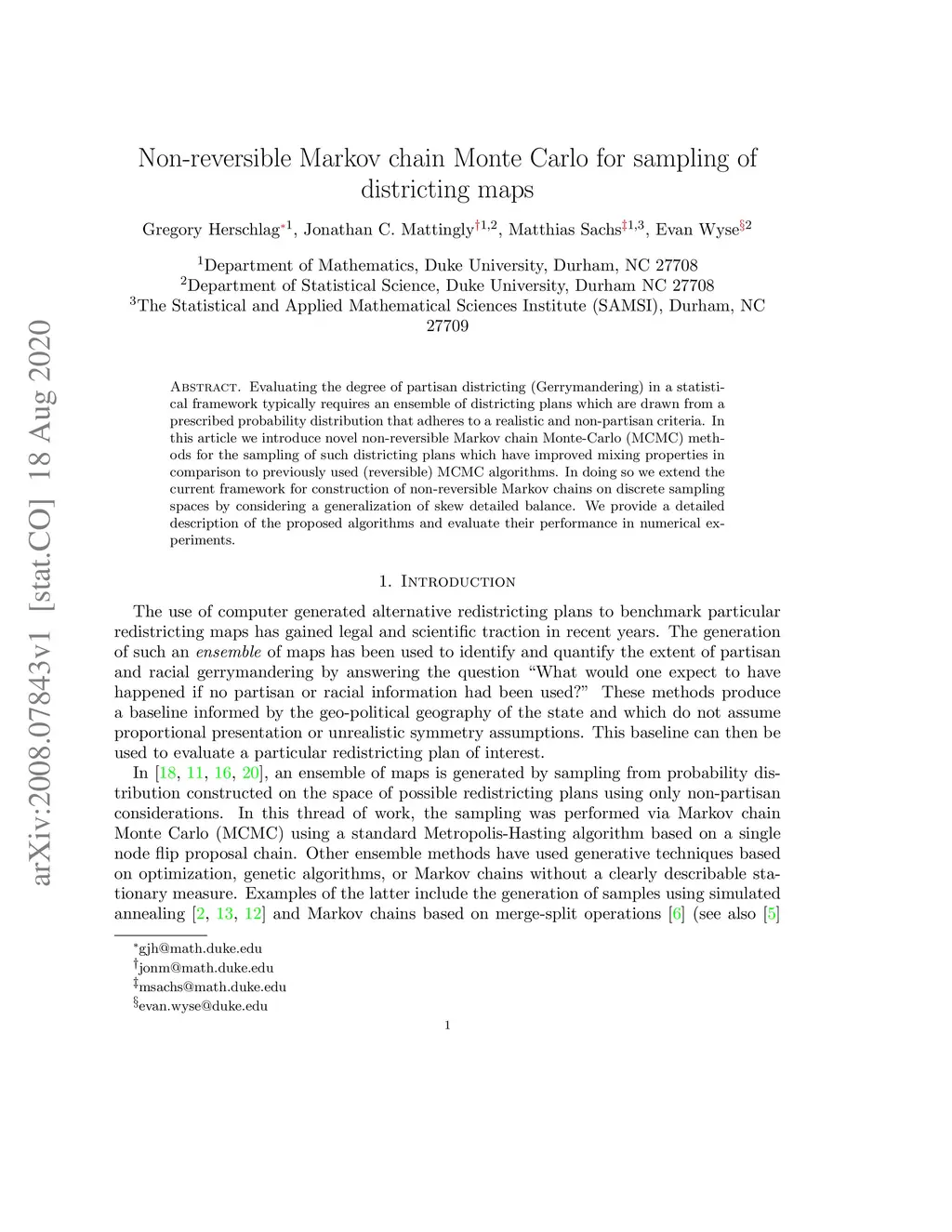 Evaluating the degree of partisan districting (Gerrymandering) in a statistical framework typically requires an ensemble of districting plans which are drawn from a prescribed probability distribution that adheres to a realistic and non-partisan criteria. In this article we introduce novel non-reversible Markov chain Monte-Carlo (MCMC) methods for the sampling of such districting plans which have improved mixing properties in comparison to previously used (reversible) MCMC algorithms. In doing so we extend the current framework for construction of non-reversible Markov chains on discrete sampling spaces by considering a generalization of skew detailed balance. We provide a detailed description of the proposed algorithms and evaluate their performance in numerical experiments.