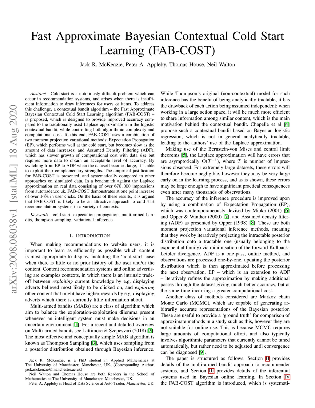 Fast Approximate Bayesian Contextual Cold Start Learning (FAB-COST)
