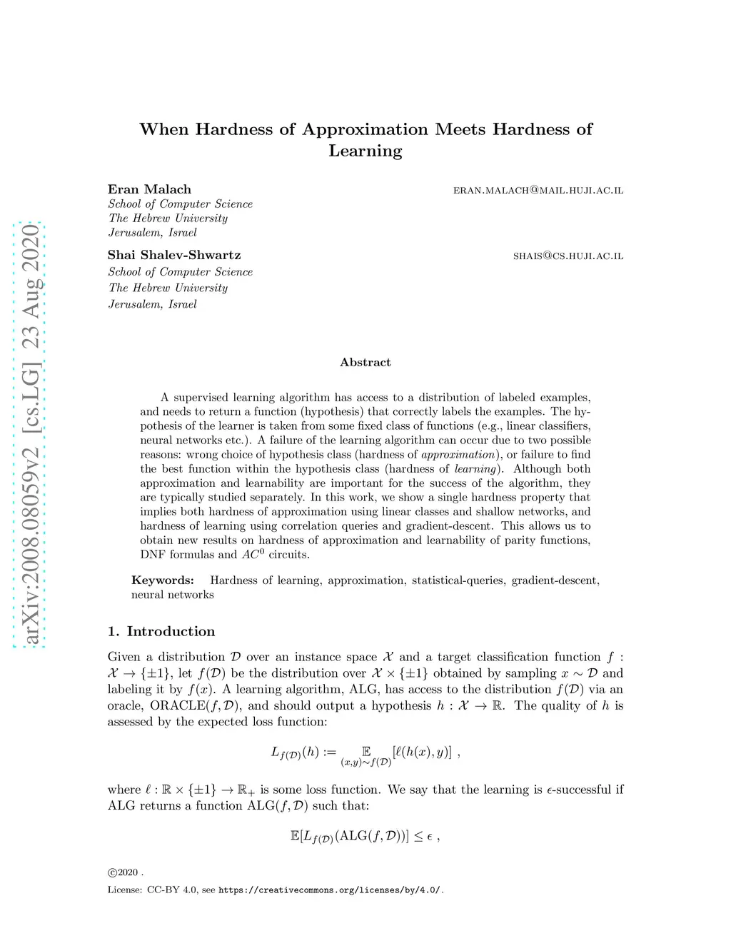 A supervised learning algorithm has access to a distribution of labeled examples, and needs to return a function (hypothesis) that correctly labels the examples. The hypothesis of the learner is taken from some fixed class of functions (e.g., linear classifiers, neural networks etc.). A failure of the learning algorithm can occur due to two possible reasons: wrong choice of hypothesis class (hardness of approximation), or failure to find the best function within the hypothesis class (hardness of learning). Although both approximation and learnability are important for the success of the algorithm, they are typically studied separately. In this work, we show a single hardness property that implies both hardness of approximation using linear classes and shallow networks, and hardness of learning using correlation queries and gradient-descent. This allows us to obtain new results on hardness of approximation and learnability of parity functions, DNF formulas and circuits.