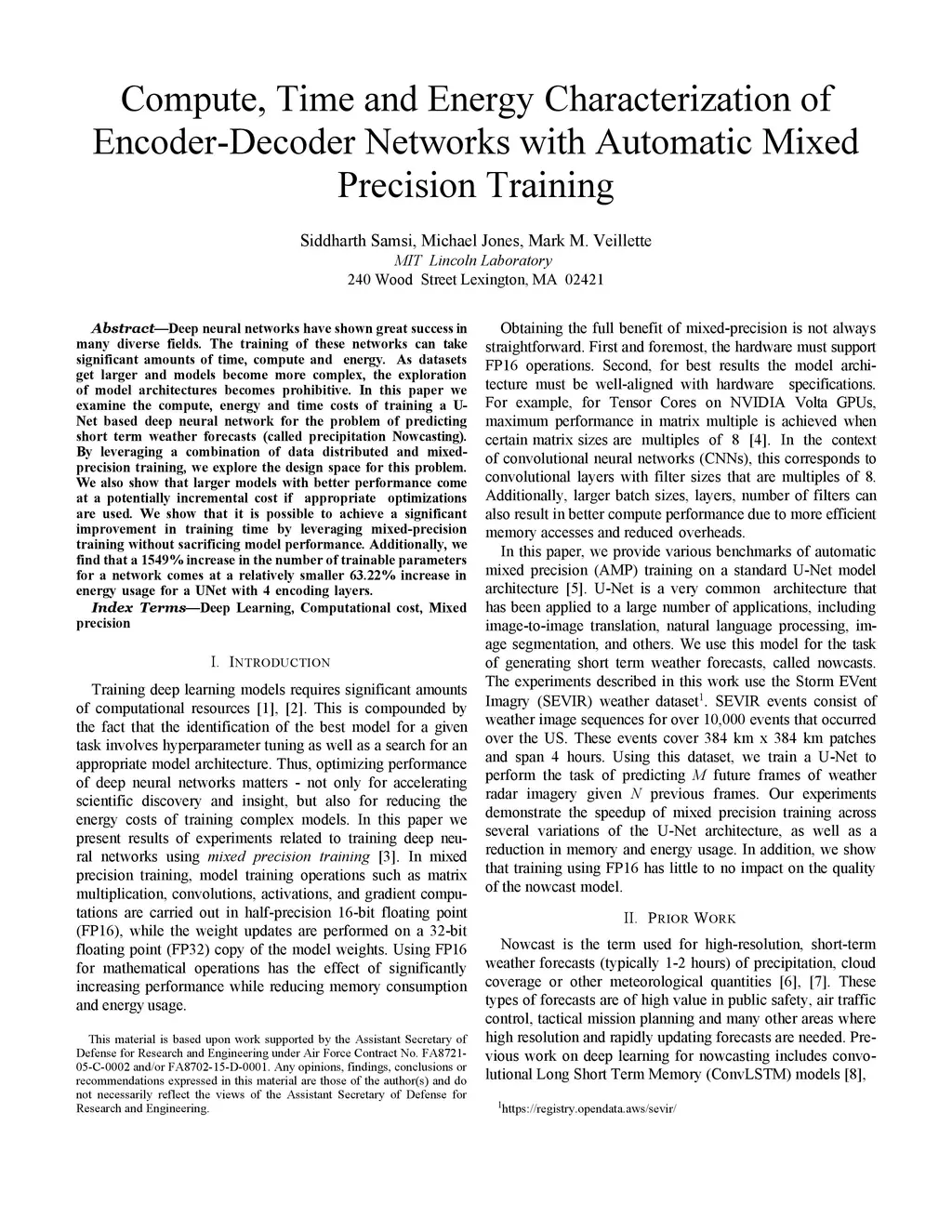 Deep neural networks have shown great success in many diverse fields. The training of these networks can take significant amounts of time, compute and energy. As datasets get larger and models become more complex, the exploration of model architectures becomes prohibitive. In this paper we examine the compute, energy and time costs of training a UNet based deep neural network for the problem of predicting short term weather forecasts (called precipitation Nowcasting). By leveraging a combination of data distributed and mixed-precision training, we explore the design space for this problem. We also show that larger models with better performance come at a potentially incremental cost if appropriate optimizations are used. We show that it is possible to achieve a significant improvement in training time by leveraging mixed-precision training without sacrificing model performance. Additionally, we find that a 1549% increase in the number of trainable parameters for a network comes at a relatively smaller 63.22% increase in energy usage for a UNet with 4 encoding layers.