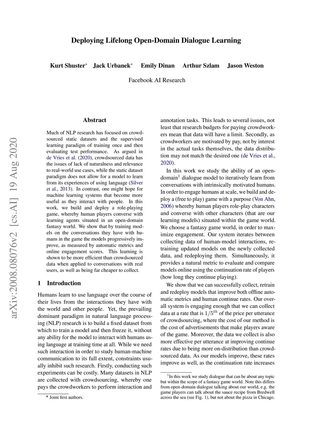Much of NLP research has focused on crowdsourced static datasets and the supervised learning paradigm of training once and then evaluating test performance. As argued in de Vries et al. (2020), crowdsourced data has the issues of lack of naturalness and relevance to real-world use cases, while the static dataset paradigm does not allow for a model to learn from its experiences of using language (Silver et al., 2013). In contrast, one might hope for machine learning systems that become more useful as they interact with people. In this work, we build and deploy a role-playing game, whereby human players converse with learning agents situated in an open-domain fantasy world. We show that by training models on the conversations they have with humans in the game the models progressively improve, as measured by automatic metrics and online engagement scores. This learning is shown to be more efficient than crowdsourced data when applied to conversations with real users, as well as being far cheaper to collect.