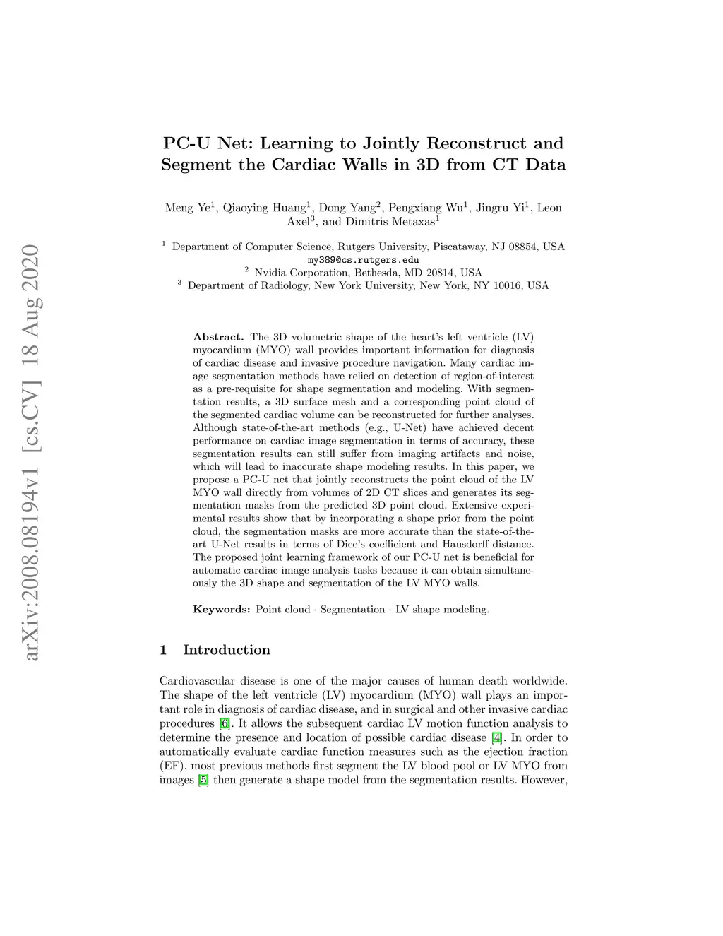 The 3D volumetric shape of the heart's left ventricle (LV) myocardium (MYO) wall provides important information for diagnosis of cardiac disease and invasive procedure navigation. Many cardiac image segmentation methods have relied on detection of region-of-interest as a pre-requisite for shape segmentation and modeling. With segmentation results, a 3D surface mesh and a corresponding point cloud of the segmented cardiac volume can be reconstructed for further analyses. Although state-of-the-art methods (e.g., U-Net) have achieved decent performance on cardiac image segmentation in terms of accuracy, these segmentation results can still suffer from imaging artifacts and noise, which will lead to inaccurate shape modeling results. In this paper, we propose a PC-U net that jointly reconstructs the point cloud of the LV MYO wall directly from volumes of 2D CT slices and generates its segmentation masks from the predicted 3D point cloud. Extensive experimental results show that by incorporating a shape prior from the point cloud, the segmentation masks are more accurate than the state-of-the-art U-Net results in terms of Dice's coefficient and Hausdorff distance.The proposed joint learning framework of our PC-U net is beneficial for automatic cardiac image analysis tasks because it can obtain simultaneously the 3D shape and segmentation of the LV MYO walls.