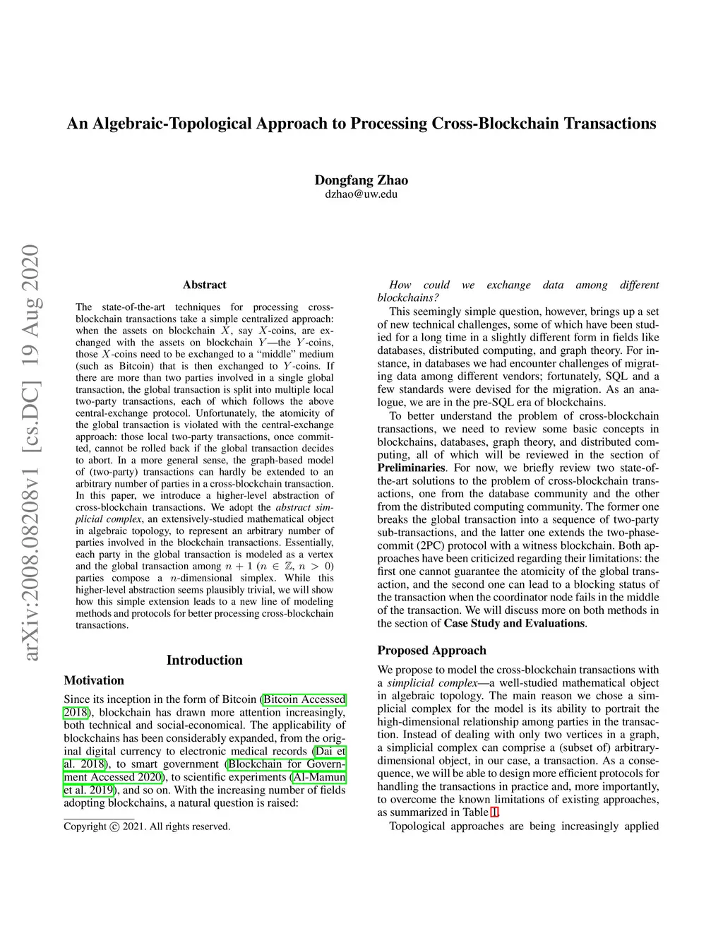 The state-of-the-art techniques for processing cross-blockchain transactions take a simple centralized approach: when the assets on blockchain , say -coins, are exchanged with the assets on blockchain ---the -coins, those -coins need to be exchanged to a "middle" medium (such as Bitcoin) that is then exchanged to -coins. If there are more than two parties involved in a single global transaction, the global transaction is split into multiple local two-party transactions, each of which follows the above central-exchange protocol. Unfortunately, the atomicity of the global transaction is violated with the central-exchange approach: those local two-party transactions, once committed, cannot be rolled back if the global transaction decides to abort. In a more general sense, the graph-based model of (two-party) transactions can hardly be extended to an arbitrary number of parties in a cross-blockchain transaction. %from why to how In this paper, we introduce a higher-level abstraction of cross-blockchain transactions. We adopt the \textit{abstract simplicial complex}, an extensively-studied mathematical object in algebraic topology, to represent an arbitrary number of parties involved in the blockchain transactions. Essentially, each party in the global transaction is modeled as a vertex and the global transaction among (, ) parties compose a -dimensional simplex. While this higher-level abstraction seems plausibly trivial, we will show how this simple extension leads to a new line of modeling methods and protocols for better processing cross-blockchain transactions.