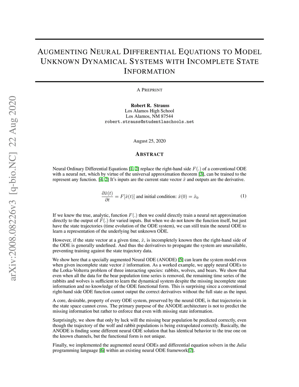 Neural Ordinary Differential Equations replace the right-hand side of a conventional ODE with a neural net, which by virtue of the universal approximation theorem, can be trained to the representation of any function. When we do not know the function itself, but have state trajectories (time evolution) of the ODE system we can still train the neural net to learn the representation of the underlying but unknown ODE. However if the state of the system is incompletely known then the right-hand side of the ODE cannot be calculated. The derivatives to propagate the system are unavailable. We show that a specially augmented Neural ODE can learn the system when given incomplete state information. As a worked example we apply neural ODEs to the Lotka-Voltera problem of 3 species, rabbits, wolves, and bears. We show that even when the data for the bear time series is removed the remaining time series of the rabbits and wolves is sufficient to learn the dynamical system despite the missing the incomplete state information. This is surprising since a conventional ODE system cannot output the correct derivatives without the full state as the input. We implement augmented neural ODEs and differential equation solvers in the julia programming language.