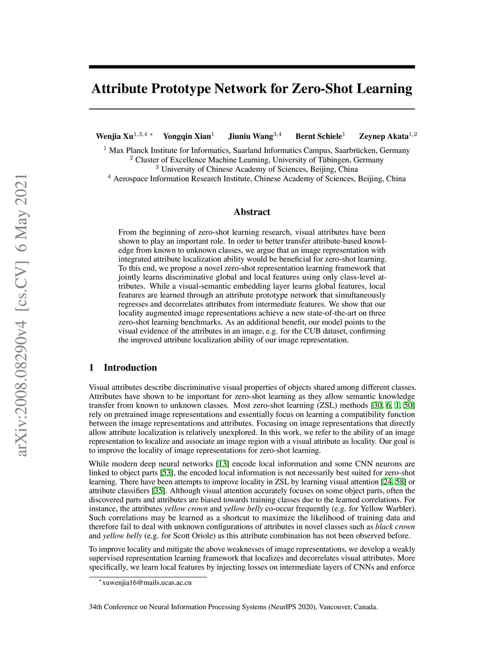 From the beginning of zero-shot learning research, visual attributes have been shown to play an important role. In order to better transfer attribute-based knowledge from known to unknown classes, we argue that an image representation with integrated attribute localization ability would be beneficial for zero-shot learning. To this end, we propose a novel zero-shot representation learning framework that jointly learns discriminative global and local features using only class-level attributes. While a visual-semantic embedding layer learns global features, local features are learned through an attribute prototype network that simultaneously regresses and decorrelates attributes from intermediate features. We show that our locality augmented image representations achieve a new state-of-the-art on three zero-shot learning benchmarks. As an additional benefit, our model points to the visual evidence of the attributes in an image, e.g. for the CUB dataset, confirming the improved attribute localization ability of our image representation.