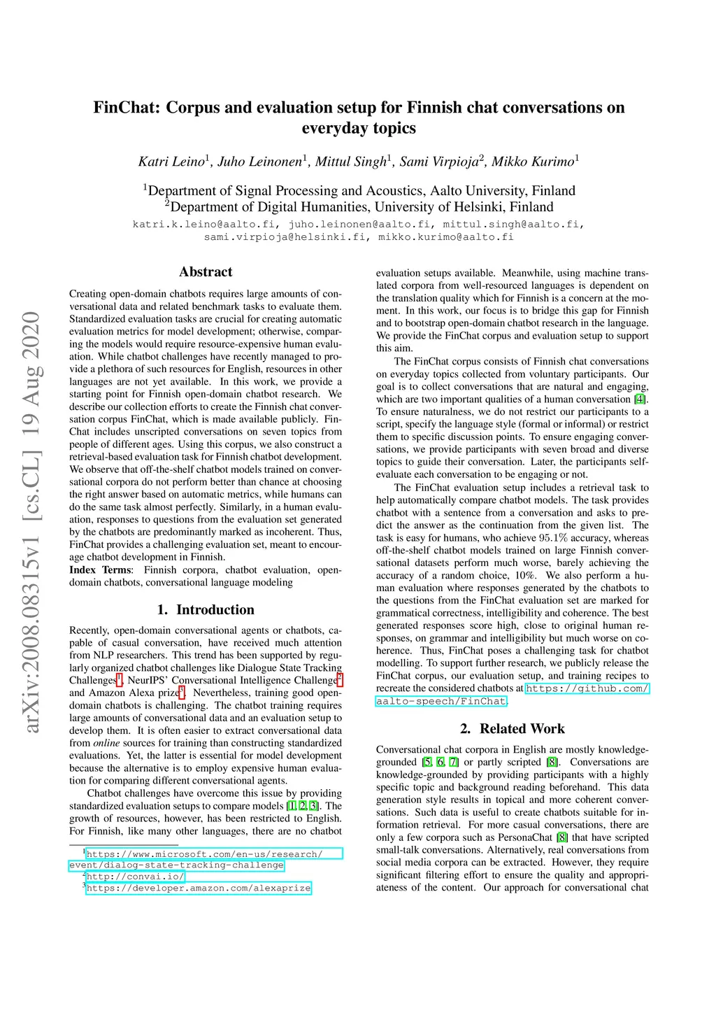 FinChat: Corpus and evaluation setup for Finnish chat conversations on