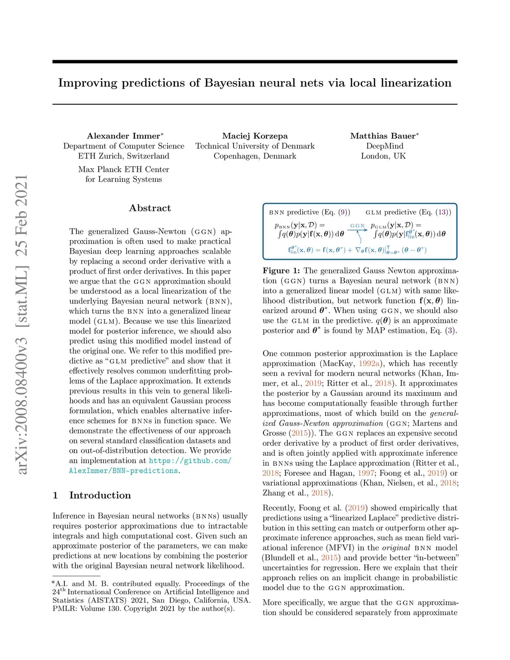 The generalized Gauss-Newton (GGN) approximation is often used to make practical Bayesian deep learning approaches scalable by replacing a second order derivative with a product of first order derivatives. In this paper we argue that the GGN approximation should be understood as a local linearization of the underlying Bayesian neural network (BNN), which turns the BNN into a generalized linear model (GLM). Because we use this linearized model for posterior inference, we should also predict using this modified model instead of the original one. We refer to this modified predictive as "GLM predictive" and show that it effectively resolves common underfitting problems of the Laplace approximation. It extends previous results in this vein to general likelihoods and has an equivalent Gaussian process formulation, which enables alternative inference schemes for BNNs in function space. We demonstrate the effectiveness of our approach on several standard classification datasets as well as on out-of-distribution detection. We provide an implementation at https://github.com/AlexImmer/BNN-predictions.