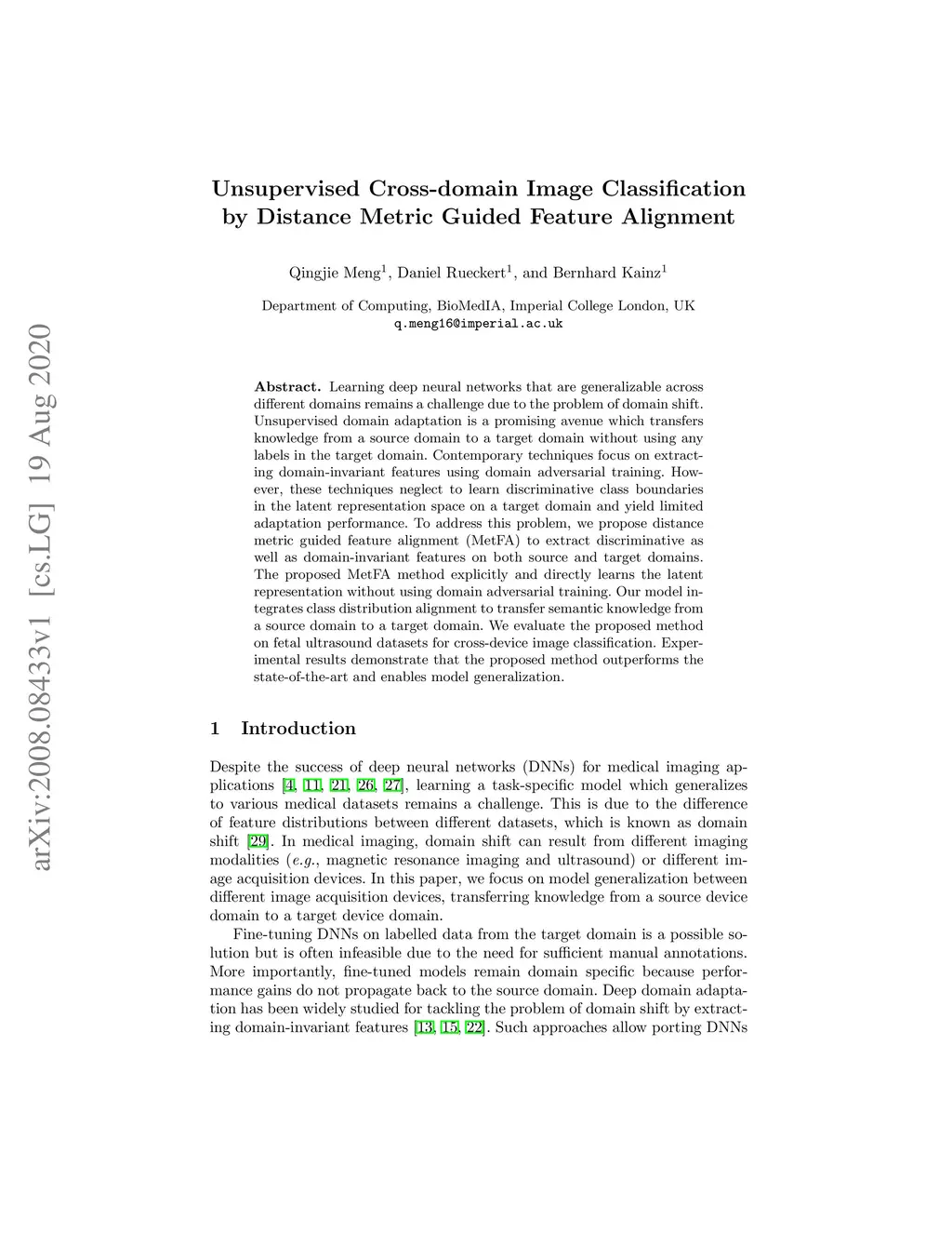 Learning deep neural networks that are generalizable across different domains remains a challenge due to the problem of domain shift. Unsupervised domain adaptation is a promising avenue which transfers knowledge from a source domain to a target domain without using any labels in the target domain. Contemporary techniques focus on extracting domain-invariant features using domain adversarial training. However, these techniques neglect to learn discriminative class boundaries in the latent representation space on a target domain and yield limited adaptation performance. To address this problem, we propose distance metric guided feature alignment (MetFA) to extract discriminative as well as domain-invariant features on both source and target domains. The proposed MetFA method explicitly and directly learns the latent representation without using domain adversarial training. Our model integrates class distribution alignment to transfer semantic knowledge from a source domain to a target domain. We evaluate the proposed method on fetal ultrasound datasets for cross-device image classification. Experimental results demonstrate that the proposed method outperforms the state-of-the-art and enables model generalization.