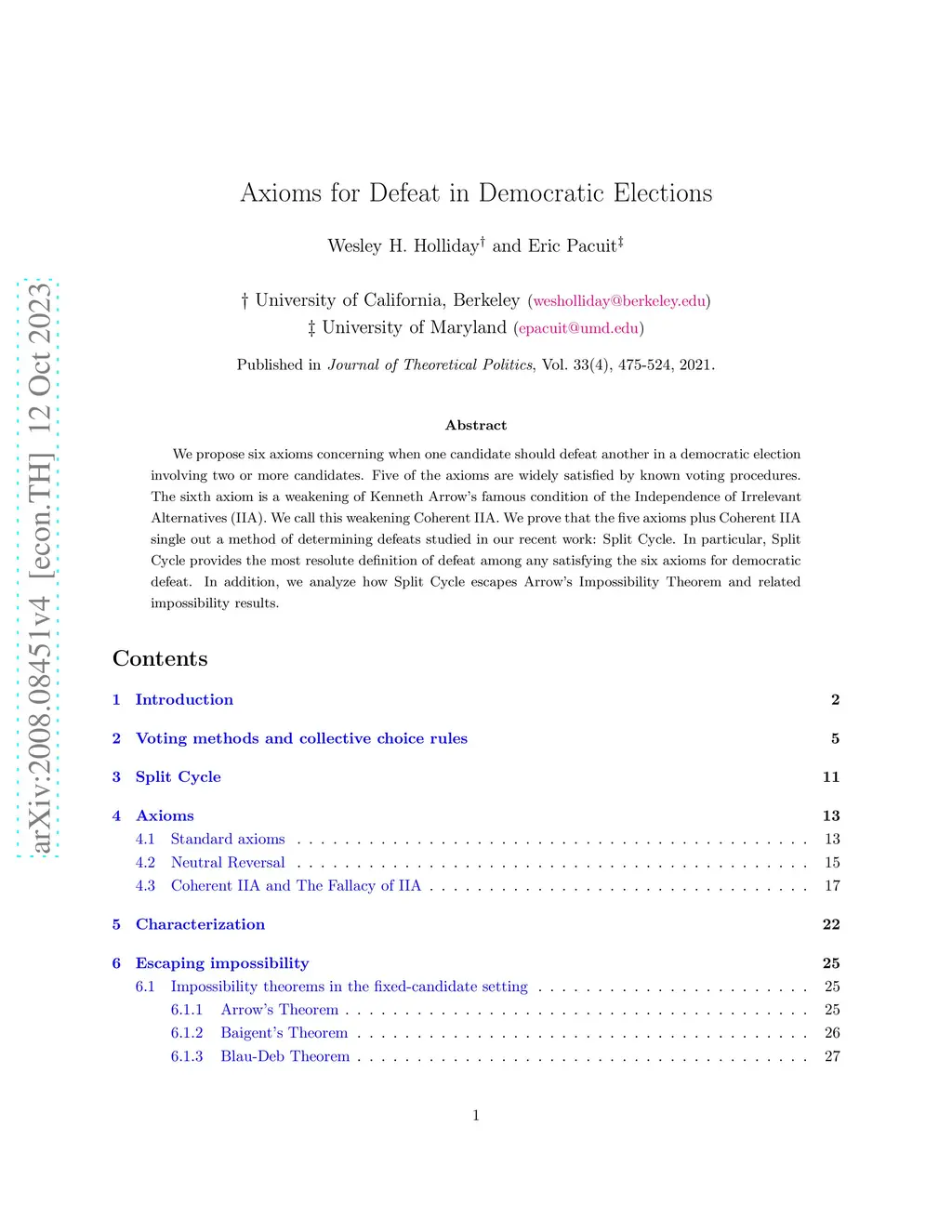 We propose six axioms concerning when one candidate should defeat another in a democratic election involving two or more candidates. Five of the axioms are widely satisfied by known voting procedures. The sixth axiom is a weakening of Kenneth Arrow's famous condition of the Independence of Irrelevant Alternatives (IIA). We call this weakening Coherent IIA. We prove that the five axioms plus Coherent IIA single out a method of determining defeats studied in our recent work: Split Cycle. In particular, Split Cycle provides the most resolute definition of defeat among any satisfying the six axioms for democratic defeat. In addition, we analyze how Split Cycle escapes Arrow's Impossibility Theorem and related impossibility results.