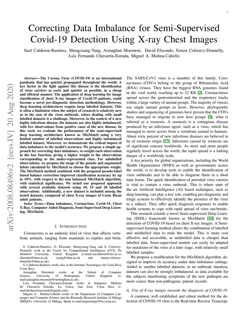 The Corona Virus (COVID-19) is an internationalpandemic that has quickly propagated throughout the world. The application of deep learning for image classification of chest X-ray images of Covid-19 patients, could become a novel pre-diagnostic detection methodology. However, deep learning architectures require large labelled datasets. This is often a limitation when the subject of research is relatively new as in the case of the virus outbreak, where dealing with small labelled datasets is a challenge. Moreover, in the context of a new highly infectious disease, the datasets are also highly imbalanced,with few observations from positive cases of the new disease. In this work we evaluate the performance of the semi-supervised deep learning architecture known as MixMatch using a very limited number of labelled observations and highly imbalanced labelled dataset. We propose a simple approach for correcting data imbalance, re-weight each observationin the loss function, giving a higher weight to the observationscorresponding to the under-represented class. For unlabelled observations, we propose the usage of the pseudo and augmentedlabels calculated by MixMatch to choose the appropriate weight. The MixMatch method combined with the proposed pseudo-label based balance correction improved classification accuracy by up to 10%, with respect to the non balanced MixMatch algorithm, with statistical significance. We tested our proposed approach with several available datasets using 10, 15 and 20 labelledobservations. Additionally, a new dataset is included among thetested datasets, composed of chest X-ray images of Costa Rican adult patients