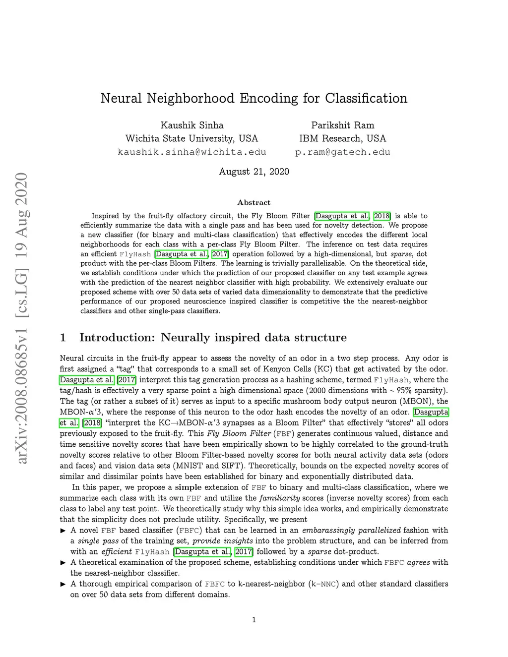 Inspired by the fruit-fly olfactory circuit, the Fly Bloom Filter [Dasgupta et al., 2018] is able to efficiently summarize the data with a single pass and has been used for novelty detection. We propose a new classifier (for binary and multi-class classification) that effectively encodes the different local neighborhoods for each class with a per-class Fly Bloom Filter. The inference on test data requires an efficient {\tt FlyHash} [Dasgupta, et al., 2017] operation followed by a high-dimensional, but {\em sparse}, dot product with the per-class Bloom Filters. The learning is trivially parallelizable. On the theoretical side, we establish conditions under which the prediction of our proposed classifier on any test example agrees with the prediction of the nearest neighbor classifier with high probability. We extensively evaluate our proposed scheme with over data sets of varied data dimensionality to demonstrate that the predictive performance of our proposed neuroscience inspired classifier is competitive the the nearest-neighbor classifiers and other single-pass classifiers.