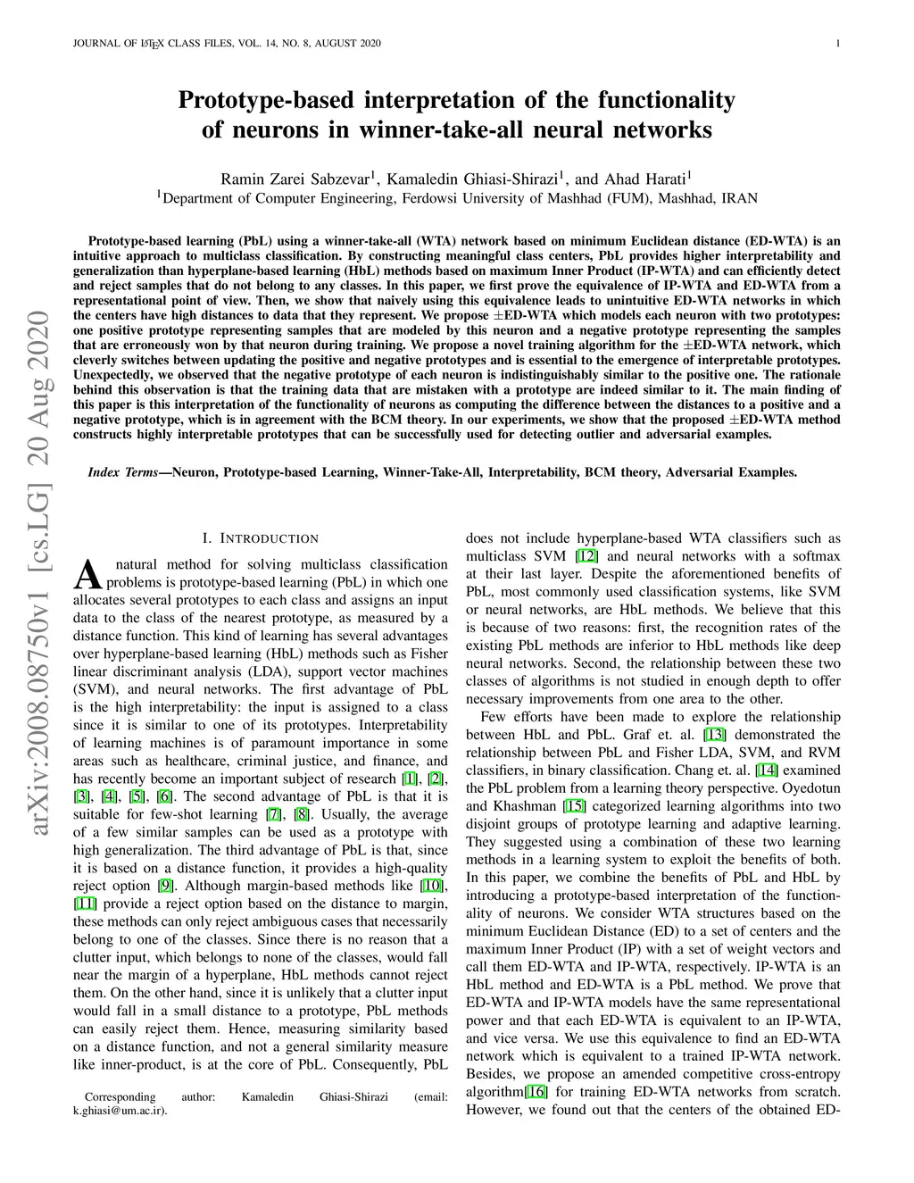 Prototype-based learning (PbL) using a winner-take-all (WTA) network based on minimum Euclidean distance (ED-WTA) is an intuitive approach to multiclass classification. By constructing meaningful class centers, PbL provides higher interpretability and generalization than hyperplane-based learning (HbL) methods based on maximum Inner Product (IP-WTA) and can efficiently detect and reject samples that do not belong to any classes. In this paper, we first prove the equivalence of IP-WTA and ED-WTA from a representational point of view. Then, we show that naively using this equivalence leads to unintuitive ED-WTA networks in which the centers have high distances to data that they represent. We propose ED-WTA which models each neuron with two prototypes: one positive prototype representing samples that are modeled by this neuron and a negative prototype representing the samples that are erroneously won by that neuron during training. We propose a novel training algorithm for the ED-WTA network, which cleverly switches between updating the positive and negative prototypes and is essential to the emergence of interpretable prototypes. Unexpectedly, we observed that the negative prototype of each neuron is indistinguishably similar to the positive one. The rationale behind this observation is that the training data that are mistaken with a prototype are indeed similar to it. The main finding of this paper is this interpretation of the functionality of neurons as computing the difference between the distances to a positive and a negative prototype, which is in agreement with the BCM theory. In our experiments, we show that the proposed ED-WTA method constructs highly interpretable prototypes that can be successfully used for detecting outlier and adversarial examples.
