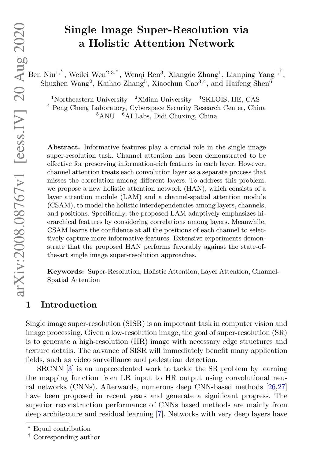Informative features play a crucial role in the single image super-resolution task. Channel attention has been demonstrated to be effective for preserving information-rich features in each layer. However, channel attention treats each convolution layer as a separate process that misses the correlation among different layers. To address this problem, we propose a new holistic attention network (HAN), which consists of a layer attention module (LAM) and a channel-spatial attention module (CSAM), to model the holistic interdependencies among layers, channels, and positions. Specifically, the proposed LAM adaptively emphasizes hierarchical features by considering correlations among layers. Meanwhile, CSAM learns the confidence at all the positions of each channel to selectively capture more informative features. Extensive experiments demonstrate that the proposed HAN performs favorably against the state-of-the-art single image super-resolution approaches.
