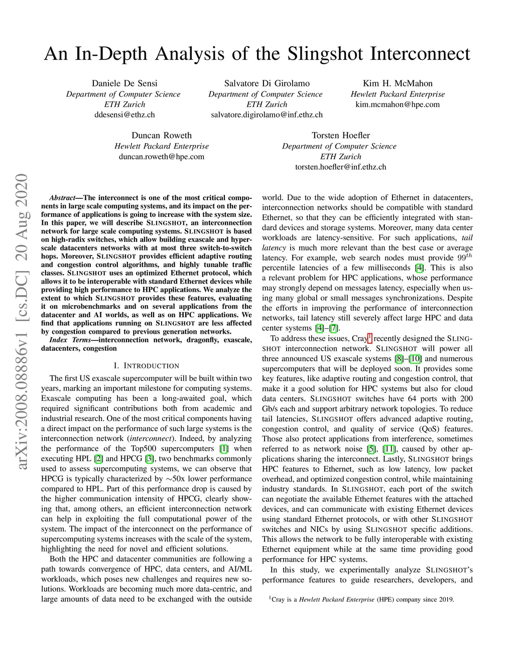 The interconnect is one of the most critical components in large scale computing systems, and its impact on the performance of applications is going to increase with the system size. In this paper, we will describe Slingshot, an interconnection network for large scale computing systems. Slingshot is based on high-radix switches, which allow building exascale and hyperscale datacenters networks with at most three switch-to-switch hops. Moreover, Slingshot provides efficient adaptive routing and congestion control algorithms, and highly tunable traffic classes. Slingshot uses an optimized Ethernet protocol, which allows it to be interoperable with standard Ethernet devices while providing high performance to HPC applications. We analyze the extent to which Slingshot provides these features, evaluating it on microbenchmarks and on several applications from the datacenter and AI worlds, as well as on HPC applications. We find that applications running on Slingshot are less affected by congestion compared to previous generation networks.
