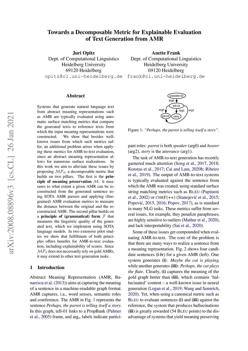 Systems that generate natural language text from abstract meaning representations such as AMR are typically evaluated using automatic surface matching metrics that compare the generated texts to reference texts from which the input meaning representations were constructed. We show that besides well-known issues from which such metrics suffer, an additional problem arises when applying these metrics for AMR-to-text evaluation, since an abstract meaning representation allows for numerous surface realizations. In this work we aim to alleviate these issues by proposing , a decomposable metric that builds on two pillars. The first is the principle of meaning preservation : it measures to what extent a given AMR can be reconstructed from the generated sentence using SOTA AMR parsers and applying (fine-grained) AMR evaluation metrics to measure the distance between the original and the reconstructed AMR. The second pillar builds on a principle of (grammatical) form that measures the linguistic quality of the generated text, which we implement using SOTA language models. In two extensive pilot studies we show that fulfillment of both principles offers benefits for AMR-to-text evaluation, including explainability of scores. Since does not necessarily rely on gold AMRs, it may extend to other text generation tasks.