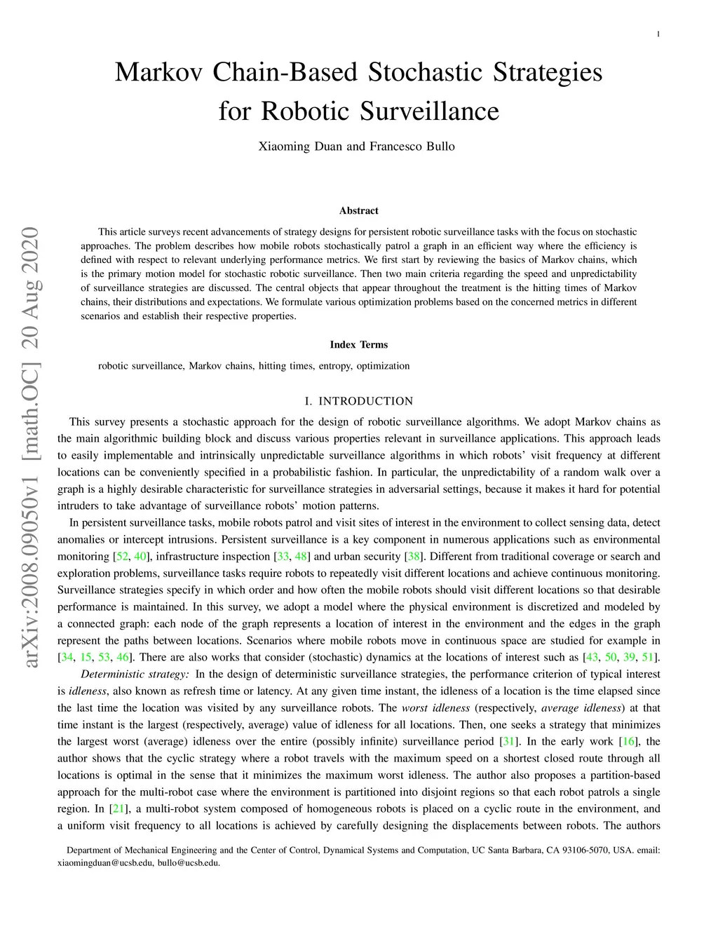 Markov Chain-Based Stochastic Strategies for Robotic Surveillance