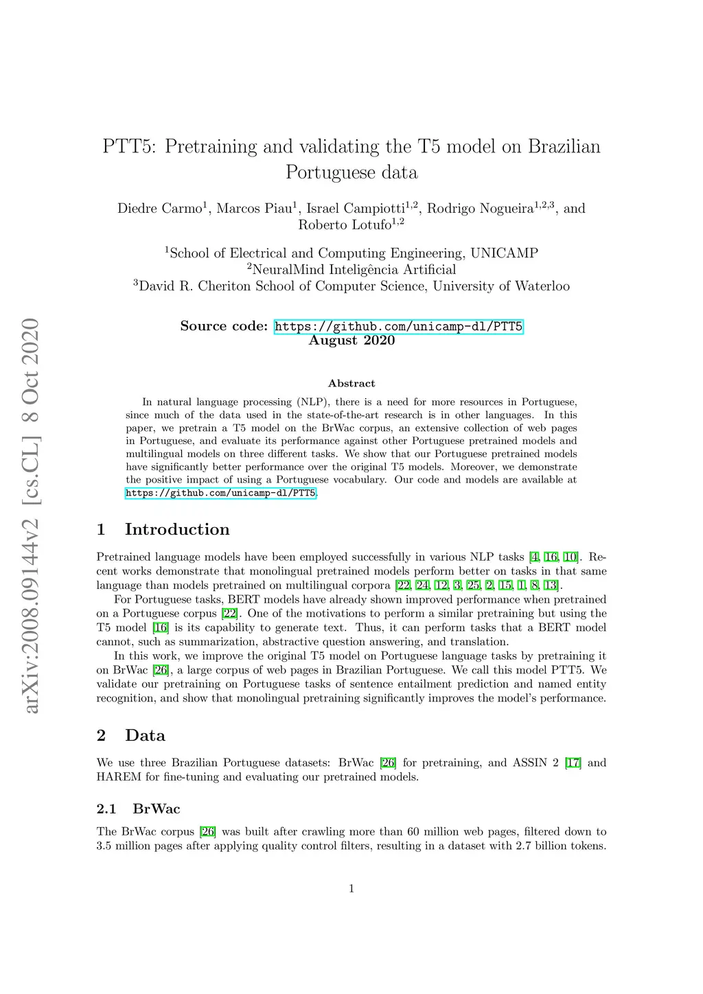 PTT5: Pretraining and validating the T5 model on Brazilian Portuguese
