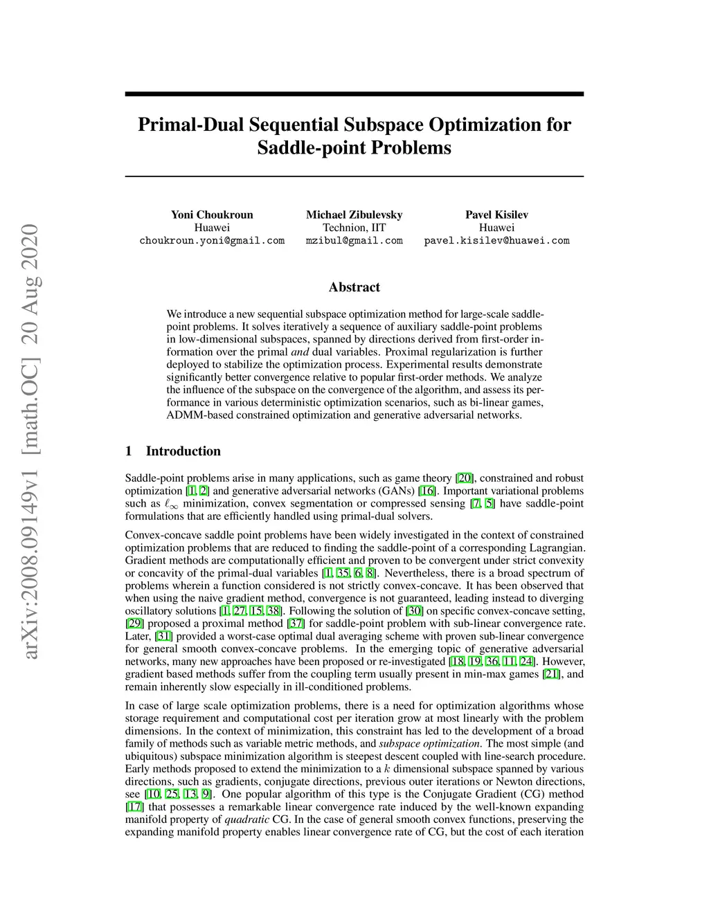 We introduce a new sequential subspace optimization method for large-scale saddle-point problems. It solves iteratively a sequence of auxiliary saddle-point problems in low-dimensional subspaces, spanned by directions derived from first-order information over the primal \emph{and} dual variables. Proximal regularization is further deployed to stabilize the optimization process. Experimental results demonstrate significantly better convergence relative to popular first-order methods. We analyze the influence of the subspace on the convergence of the algorithm, and assess its performance in various deterministic optimization scenarios, such as bi-linear games, ADMM-based constrained optimization and generative adversarial networks.