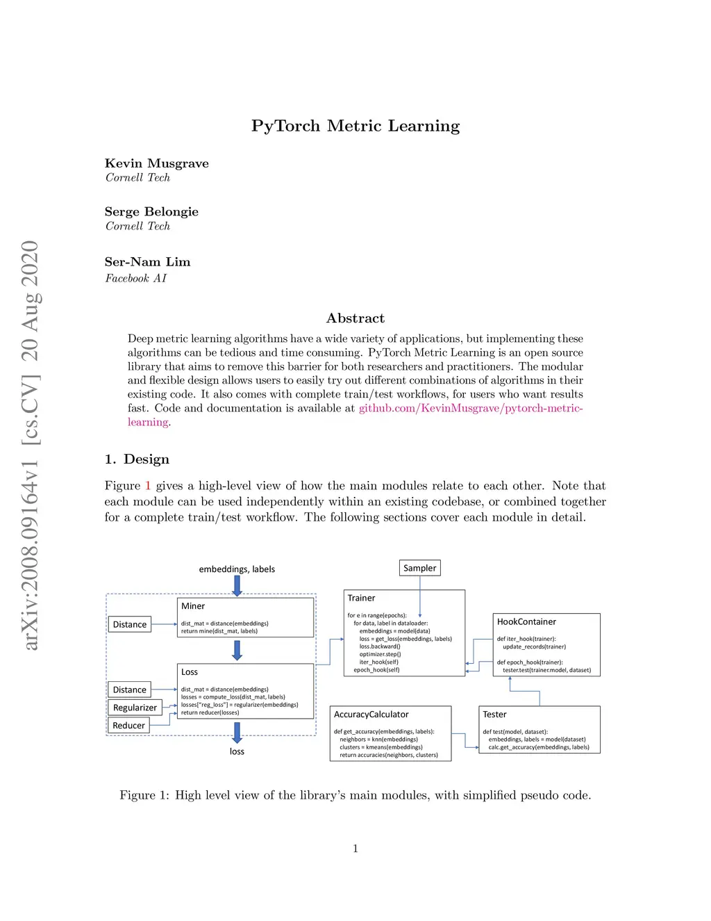 Deep metric learning algorithms have a wide variety of applications, but implementing these algorithms can be tedious and time consuming. PyTorch Metric Learning is an open source library that aims to remove this barrier for both researchers and practitioners. The modular and flexible design allows users to easily try out different combinations of algorithms in their existing code. It also comes with complete train/test workflows, for users who want results fast. Code and documentation is available at https://www.github.com/KevinMusgrave/pytorch-metric-learning.