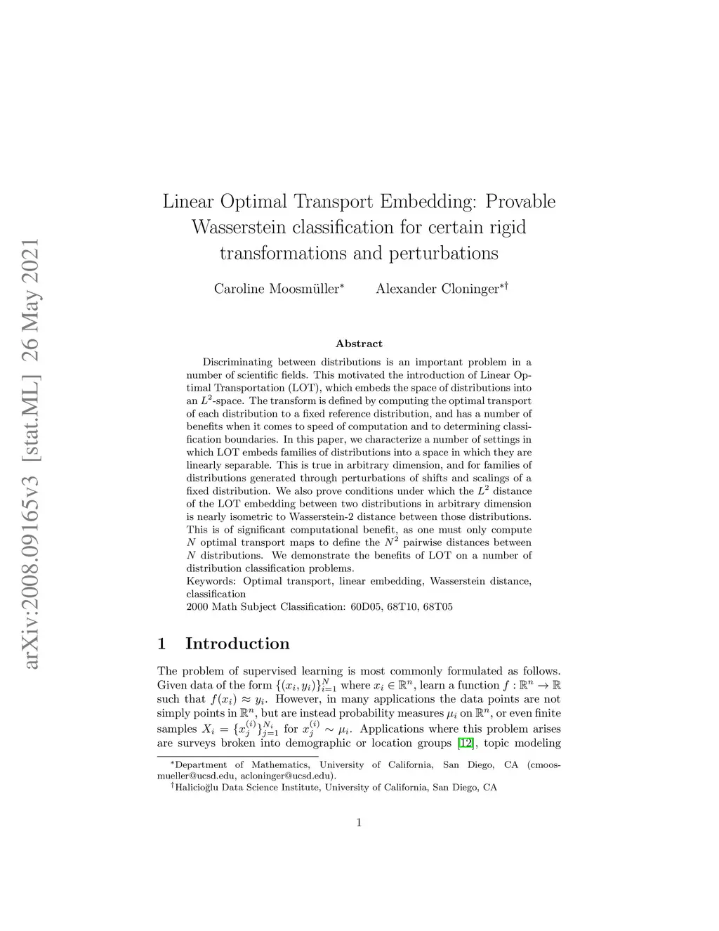 Discriminating between distributions is an important problem in a number of scientific fields. This motivated the introduction of Linear Optimal Transportation (LOT), which embeds the space of distributions into an -space. The transform is defined by computing the optimal transport of each distribution to a fixed reference distribution, and has a number of benefits when it comes to speed of computation and to determining classification boundaries. In this paper, we characterize a number of settings in which LOT embeds families of distributions into a space in which they are linearly separable. This is true in arbitrary dimension, and for families of distributions generated through perturbations of shifts and scalings of a fixed distribution.We also prove conditions under which the distance of the LOT embedding between two distributions in arbitrary dimension is nearly isometric to Wasserstein-2 distance between those distributions. This is of significant computational benefit, as one must only compute optimal transport maps to define the pairwise distances between distributions. We demonstrate the benefits of LOT on a number of distribution classification problems.