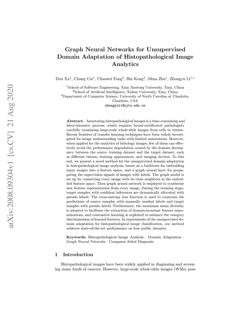 Annotating histopathological images is a time-consuming andlabor-intensive process, which requires broad-certificated pathologistscarefully examining large-scale whole-slide images from cells to tissues.Recent frontiers of transfer learning techniques have been widely investi-gated for image understanding tasks with limited annotations. However,when applied for the analytics of histology images, few of them can effec-tively avoid the performance degradation caused by the domain discrep-ancy between the source training dataset and the target dataset, suchas different tissues, staining appearances, and imaging devices. To thisend, we present a novel method for the unsupervised domain adaptationin histopathological image analysis, based on a backbone for embeddinginput images into a feature space, and a graph neural layer for propa-gating the supervision signals of images with labels. The graph model isset up by connecting every image with its close neighbors in the embed-ded feature space. Then graph neural network is employed to synthesizenew feature representation from every image. During the training stage,target samples with confident inferences are dynamically allocated withpseudo labels. The cross-entropy loss function is used to constrain thepredictions of source samples with manually marked labels and targetsamples with pseudo labels. Furthermore, the maximum mean diversityis adopted to facilitate the extraction of domain-invariant feature repre-sentations, and contrastive learning is exploited to enhance the categorydiscrimination of learned features. In experiments of the unsupervised do-main adaptation for histopathological image classification, our methodachieves state-of-the-art performance on four public datasets