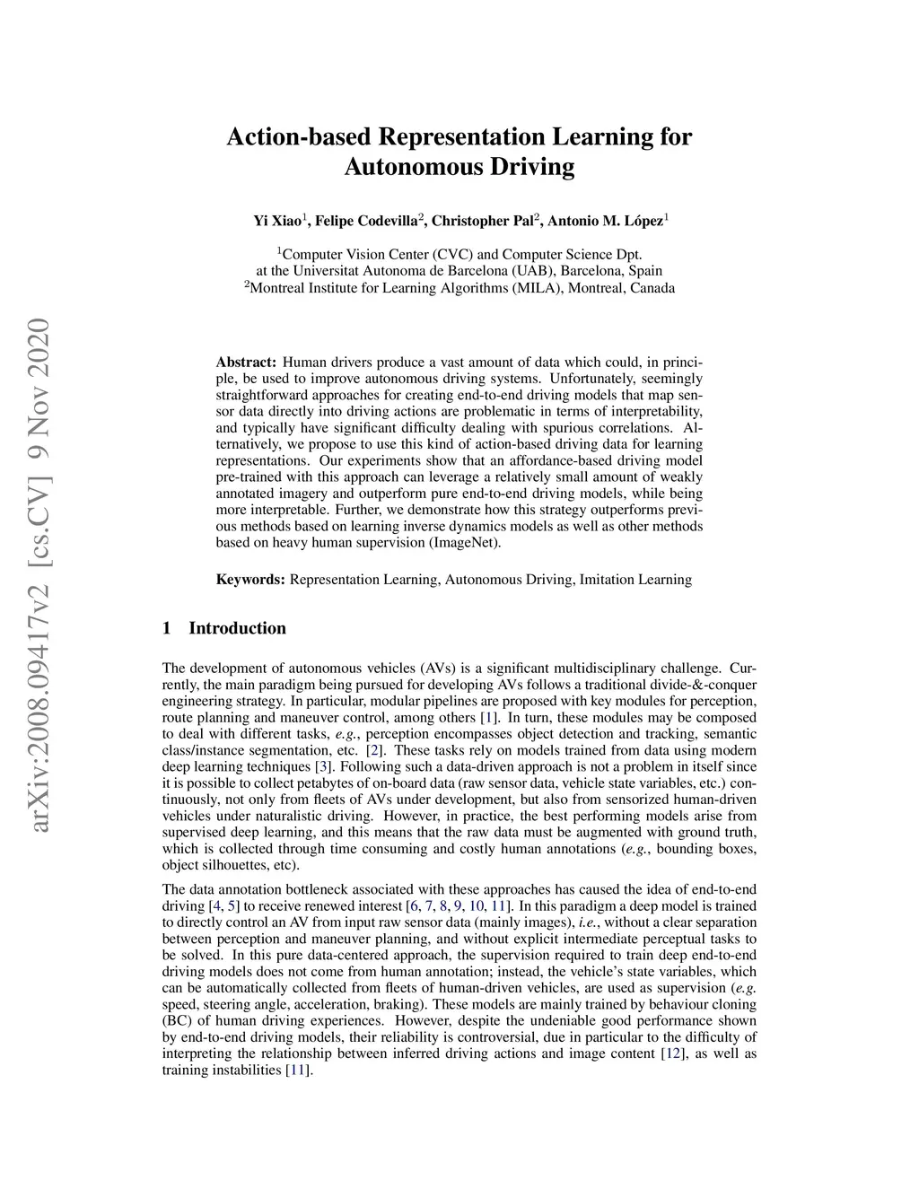 Human drivers produce a vast amount of data which could, in principle, be used to improve autonomous driving systems. Unfortunately, seemingly straightforward approaches for creating end-to-end driving models that map sensor data directly into driving actions are problematic in terms of interpretability, and typically have significant difficulty dealing with spurious correlations. Alternatively, we propose to use this kind of action-based driving data for learning representations. Our experiments show that an affordance-based driving model pre-trained with this approach can leverage a relatively small amount of weakly annotated imagery and outperform pure end-to-end driving models, while being more interpretable. Further, we demonstrate how this strategy outperforms previous methods based on learning inverse dynamics models as well as other methods based on heavy human supervision (ImageNet).