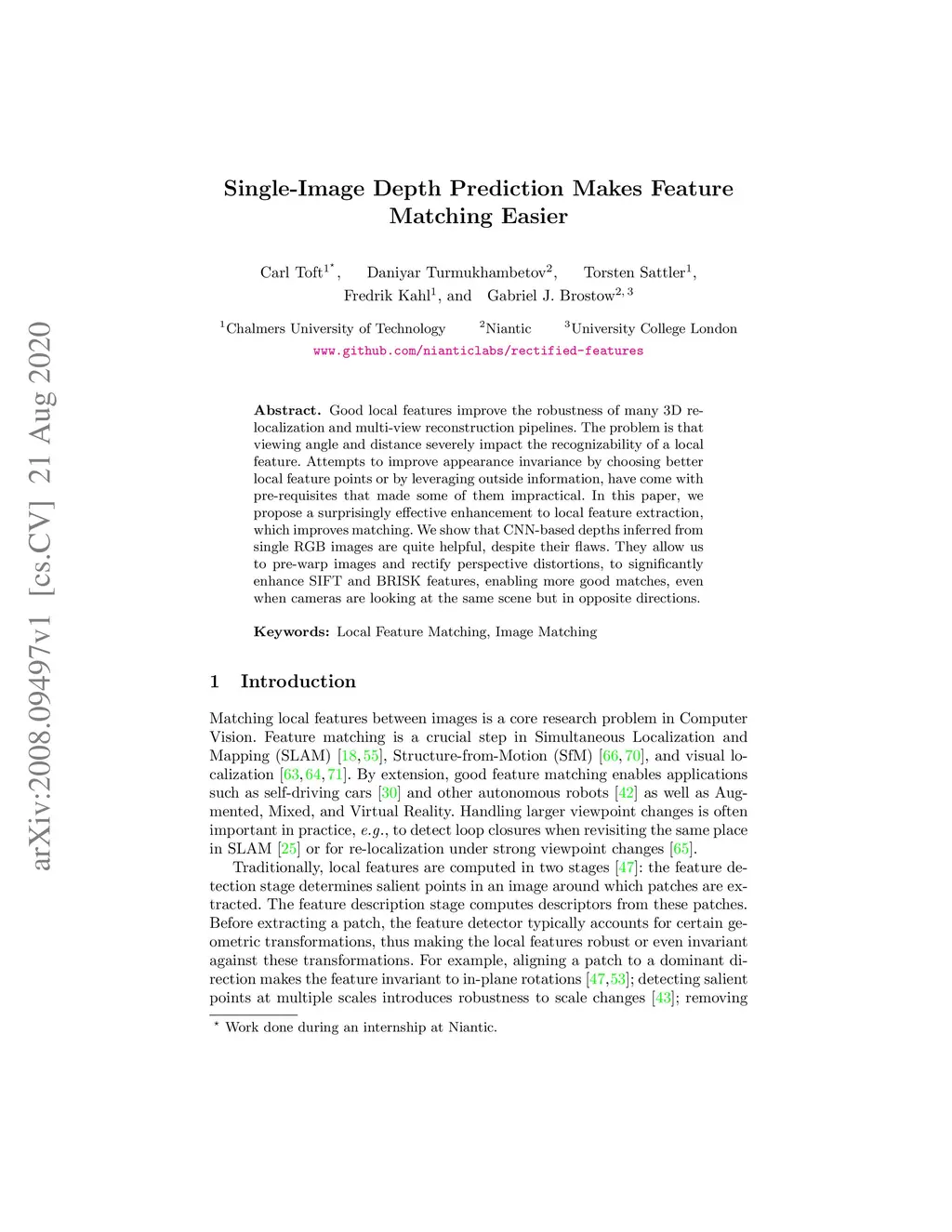 Good local features improve the robustness of many 3D re-localization and multi-view reconstruction pipelines. The problem is that viewing angle and distance severely impact the recognizability of a local feature. Attempts to improve appearance invariance by choosing better local feature points or by leveraging outside information, have come with pre-requisites that made some of them impractical. In this paper, we propose a surprisingly effective enhancement to local feature extraction, which improves matching. We show that CNN-based depths inferred from single RGB images are quite helpful, despite their flaws. They allow us to pre-warp images and rectify perspective distortions, to significantly enhance SIFT and BRISK features, enabling more good matches, even when cameras are looking at the same scene but in opposite directions.