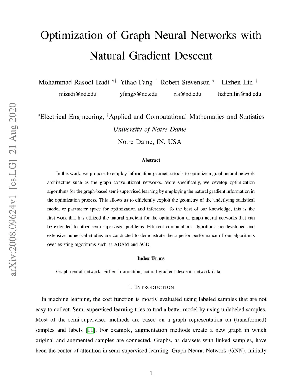 In this work, we propose to employ information-geometric tools to optimize a graph neural network architecture such as the graph convolutional networks. More specifically, we develop optimization algorithms for the graph-based semi-supervised learning by employing the natural gradient information in the optimization process. This allows us to efficiently exploit the geometry of the underlying statistical model or parameter space for optimization and inference. To the best of our knowledge, this is the first work that has utilized the natural gradient for the optimization of graph neural networks that can be extended to other semi-supervised problems. Efficient computations algorithms are developed and extensive numerical studies are conducted to demonstrate the superior performance of our algorithms over existing algorithms such as ADAM and SGD.