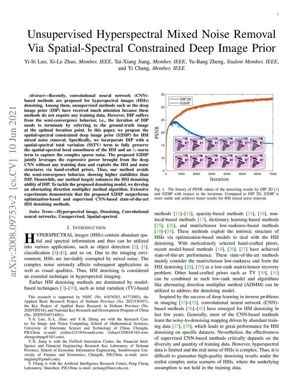 Recently, convolutional neural network (CNN)-based methods are proposed for hyperspectral images (HSIs) denoising. Among them, unsupervised methods such as the deep image prior (DIP) have received much attention because these methods do not require any training data. However, DIP suffers from the semi-convergence behavior, i.e., the iteration of DIP needs to terminate by referring to the ground-truth image at the optimal iteration point. In this paper, we propose the spatial-spectral constrained deep image prior (S2DIP) for HSI mixed noise removal. Specifically, we incorporate DIP with a spatial-spectral total variation (SSTV) term to fully preserve the spatial-spectral local smoothness of the HSI and an -norm term to capture the complex sparse noise. The proposed S2DIP jointly leverages the expressive power brought from the deep CNN without any training data and exploits the HSI and noise structures via hand-crafted priors. Thus, our method avoids the semi-convergence behavior, showing higher stabilities than DIP. Meanwhile, our method largely enhances the HSI denoising ability of DIP. To tackle the proposed denoising model, we develop an alternating direction multiplier method algorithm. Extensive experiments demonstrate that the proposed S2DIP outperforms optimization-based and supervised CNN-based state-of-the-art HSI denoising methods.