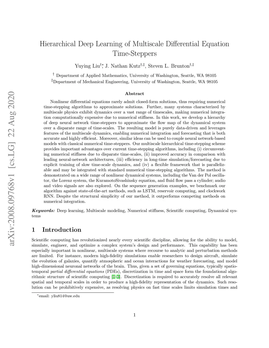 Nonlinear differential equations rarely admit closed-form solutions, thus requiring numerical time-stepping algorithms to approximate solutions. Further, many systems characterized by multiscale physics exhibit dynamics over a vast range of timescales, making numerical integration computationally expensive due to numerical stiffness. In this work, we develop a hierarchy of deep neural network time-steppers to approximate the flow map of the dynamical system over a disparate range of time-scales. The resulting model is purely data-driven and leverages features of the multiscale dynamics, enabling numerical integration and forecasting that is both accurate and highly efficient. Moreover, similar ideas can be used to couple neural network-based models with classical numerical time-steppers. Our multiscale hierarchical time-stepping scheme provides important advantages over current time-stepping algorithms, including (i) circumventing numerical stiffness due to disparate time-scales, (ii) improved accuracy in comparison with leading neural-network architectures, (iii) efficiency in long-time simulation/forecasting due to explicit training of slow time-scale dynamics, and (iv) a flexible framework that is parallelizable and may be integrated with standard numerical time-stepping algorithms. The method is demonstrated on a wide range of nonlinear dynamical systems, including the Van der Pol oscillator, the Lorenz system, the Kuramoto-Sivashinsky equation, and fluid flow pass a cylinder; audio and video signals are also explored. On the sequence generation examples, we benchmark our algorithm against state-of-the-art methods, such as LSTM, reservoir computing, and clockwork RNN. Despite the structural simplicity of our method, it outperforms competing methods on numerical integration.