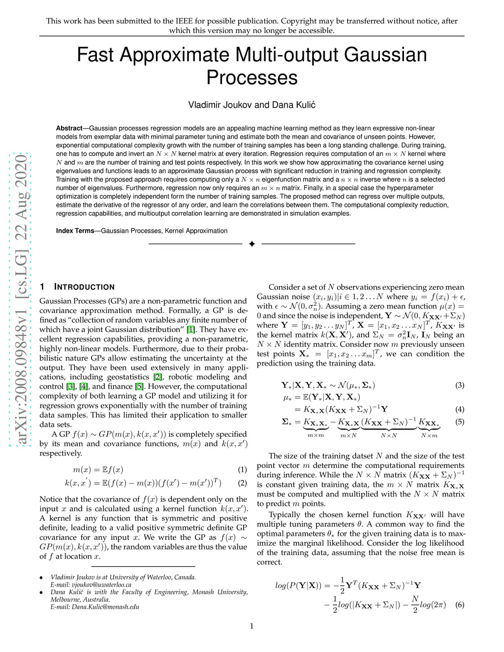 Gaussian processes regression models are an appealing machine learning method as they learn expressive non-linear models from exemplar data with minimal parameter tuning and estimate both the mean and covariance of unseen points. However, exponential computational complexity growth with the number of training samples has been a long standing challenge. During training, one has to compute and invert an kernel matrix at every iteration. Regression requires computation of an kernel where and are the number of training and test points respectively. In this work we show how approximating the covariance kernel using eigenvalues and functions leads to an approximate Gaussian process with significant reduction in training and regression complexity. Training with the proposed approach requires computing only a eigenfunction matrix and a inverse where is a selected number of eigenvalues. Furthermore, regression now only requires an matrix. Finally, in a special case the hyperparameter optimization is completely independent form the number of training samples. The proposed method can regress over multiple outputs, estimate the derivative of the regressor of any order, and learn the correlations between them. The computational complexity reduction, regression capabilities, and multioutput correlation learning are demonstrated in simulation examples.