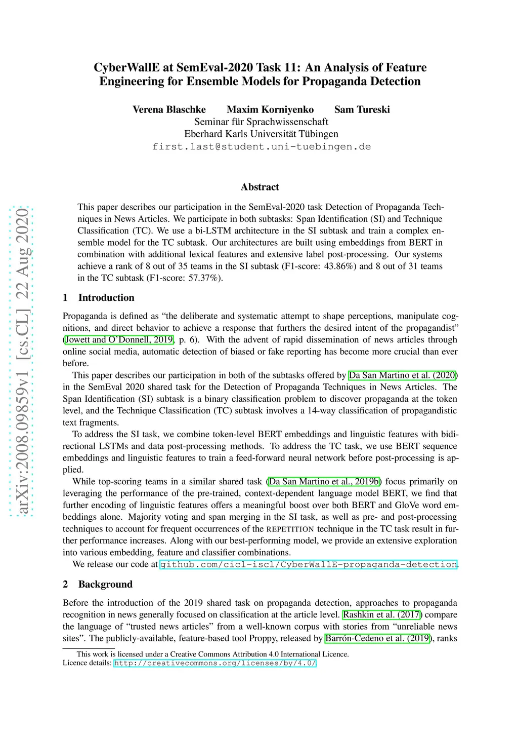 This paper describes our participation in the SemEval-2020 task Detection of Propaganda Techniques in News Articles. We participate in both subtasks: Span Identification (SI) and Technique Classification (TC). We use a bi-LSTM architecture in the SI subtask and train a complex ensemble model for the TC subtask. Our architectures are built using embeddings from BERT in combination with additional lexical features and extensive label post-processing. Our systems achieve a rank of 8 out of 35 teams in the SI subtask (F1-score: 43.86%) and 8 out of 31 teams in the TC subtask (F1-score: 57.37%).