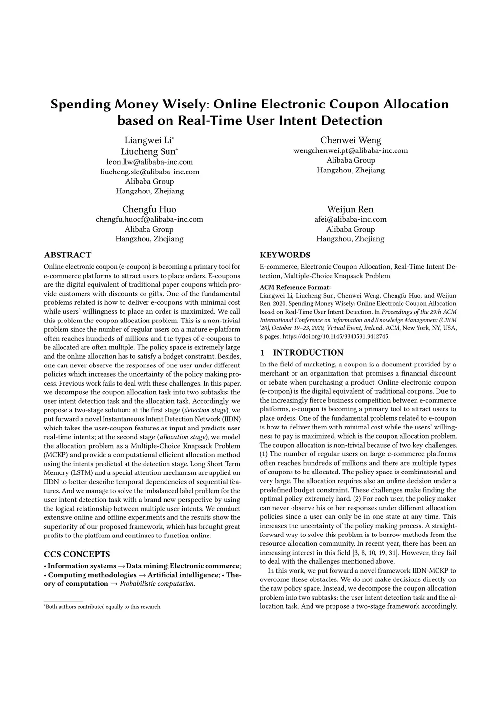 Online electronic coupon (e-coupon) is becoming a primary tool for e-commerce platforms to attract users to place orders. E-coupons are the digital equivalent of traditional paper coupons which provide customers with discounts or gifts. One of the fundamental problems related is how to deliver e-coupons with minimal cost while users' willingness to place an order is maximized. We call this problem the coupon allocation problem. This is a non-trivial problem since the number of regular users on a mature e-platform often reaches hundreds of millions and the types of e-coupons to be allocated are often multiple. The policy space is extremely large and the online allocation has to satisfy a budget constraint. Besides, one can never observe the responses of one user under different policies which increases the uncertainty of the policy making process. Previous work fails to deal with these challenges. In this paper, we decompose the coupon allocation task into two subtasks: the user intent detection task and the allocation task. Accordingly, we propose a two-stage solution: at the first stage (detection stage), we put forward a novel Instantaneous Intent Detection Network (IIDN) which takes the user-coupon features as input and predicts user real-time intents; at the second stage (allocation stage), we model the allocation problem as a Multiple-Choice Knapsack Problem (MCKP) and provide a computational efficient allocation method using the intents predicted at the detection stage. We conduct extensive online and offline experiments and the results show the superiority of our proposed framework, which has brought great profits to the platform and continues to function online.