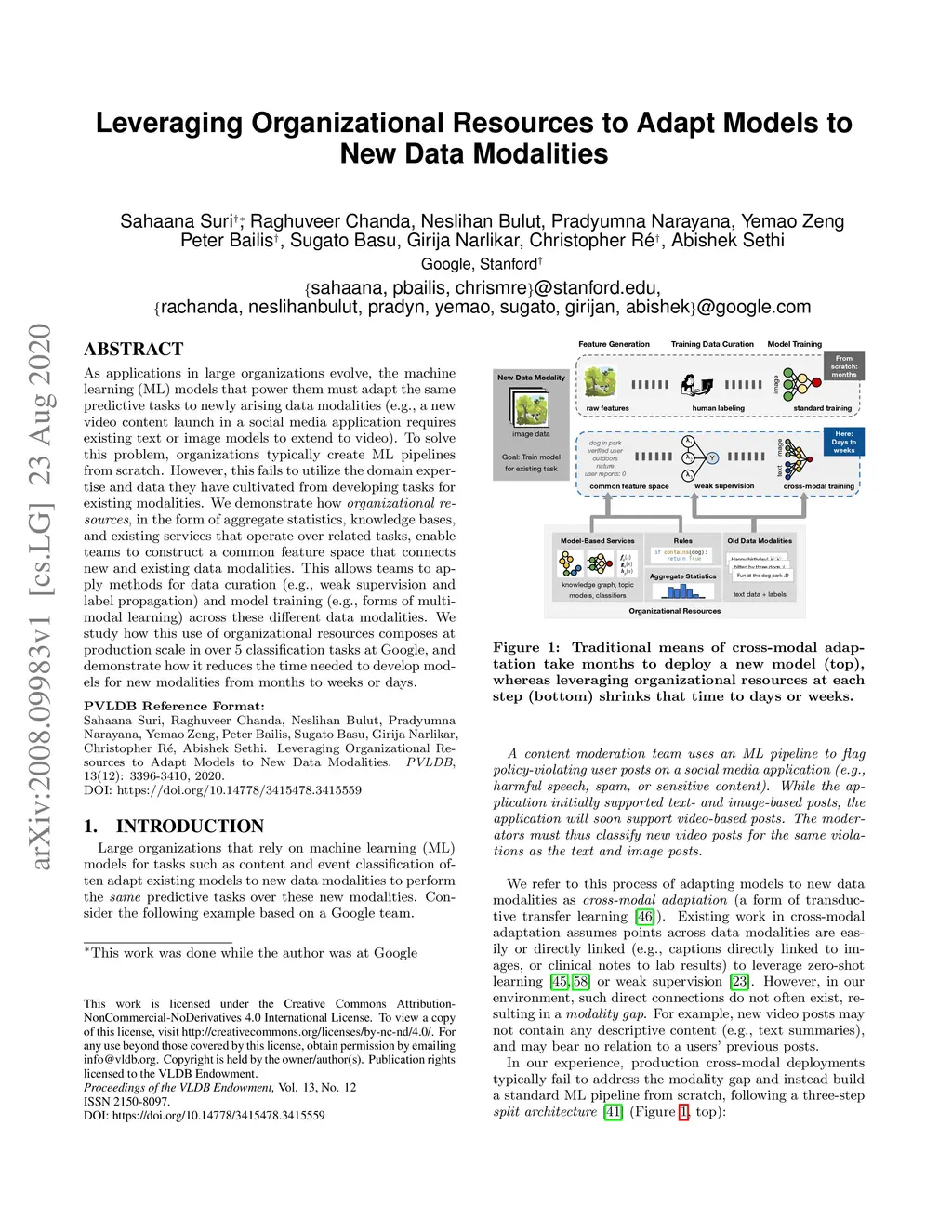 As applications in large organizations evolve, the machine learning (ML) models that power them must adapt the same predictive tasks to newly arising data modalities (e.g., a new video content launch in a social media application requires existing text or image models to extend to video). To solve this problem, organizations typically create ML pipelines from scratch. However, this fails to utilize the domain expertise and data they have cultivated from developing tasks for existing modalities. We demonstrate how organizational resources, in the form of aggregate statistics, knowledge bases, and existing services that operate over related tasks, enable teams to construct a common feature space that connects new and existing data modalities. This allows teams to apply methods for training data curation (e.g., weak supervision and label propagation) and model training (e.g., forms of multi-modal learning) across these different data modalities. We study how this use of organizational resources composes at production scale in over 5 classification tasks at Google, and demonstrate how it reduces the time needed to develop models for new modalities from months to weeks to days.