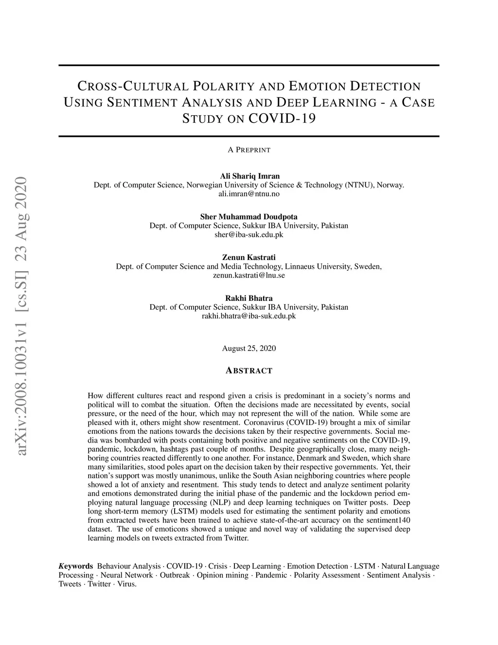 How different cultures react and respond given a crisis is predominant in a society's norms and political will to combat the situation. Often the decisions made are necessitated by events, social pressure, or the need of the hour, which may not represent the will of the nation. While some are pleased with it, others might show resentment. Coronavirus (COVID-19) brought a mix of similar emotions from the nations towards the decisions taken by their respective governments. Social media was bombarded with posts containing both positive and negative sentiments on the COVID-19, pandemic, lockdown, hashtags past couple of months. Despite geographically close, many neighboring countries reacted differently to one another. For instance, Denmark and Sweden, which share many similarities, stood poles apart on the decision taken by their respective governments. Yet, their nation's support was mostly unanimous, unlike the South Asian neighboring countries where people showed a lot of anxiety and resentment. This study tends to detect and analyze sentiment polarity and emotions demonstrated during the initial phase of the pandemic and the lockdown period employing natural language processing (NLP) and deep learning techniques on Twitter posts. Deep long short-term memory (LSTM) models used for estimating the sentiment polarity and emotions from extracted tweets have been trained to achieve state-of-the-art accuracy on the sentiment140 dataset. The use of emoticons showed a unique and novel way of validating the supervised deep learning models on tweets extracted from Twitter.