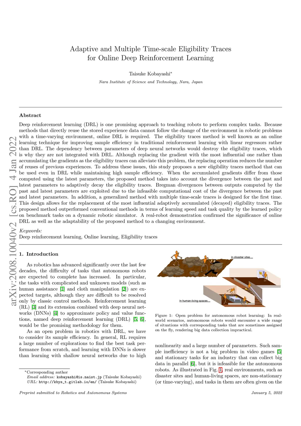 Deep reinforcement learning (DRL) is one promising approach to teaching robots to perform complex tasks. Because methods that directly reuse the stored experience data cannot follow the change of the environment in robotic problems with a time-varying environment, online DRL is required. The eligibility traces method is well known as an online learning technique for improving sample efficiency in traditional reinforcement learning with linear regressors rather than DRL. The dependency between parameters of deep neural networks would destroy the eligibility traces, which is why they are not integrated with DRL. Although replacing the gradient with the most influential one rather than accumulating the gradients as the eligibility traces can alleviate this problem, the replacing operation reduces the number of reuses of previous experiences. To address these issues, this study proposes a new eligibility traces method that can be used even in DRL while maintaining high sample efficiency. When the accumulated gradients differ from those computed using the latest parameters, the proposed method takes into account the divergence between the past and latest parameters to adaptively decay the eligibility traces. Bregman divergences between outputs computed by the past and latest parameters are exploited due to the infeasible computational cost of the divergence between the past and latest parameters. In addition, a generalized method with multiple time-scale traces is designed for the first time. This design allows for the replacement of the most influential adaptively accumulated (decayed) eligibility traces.