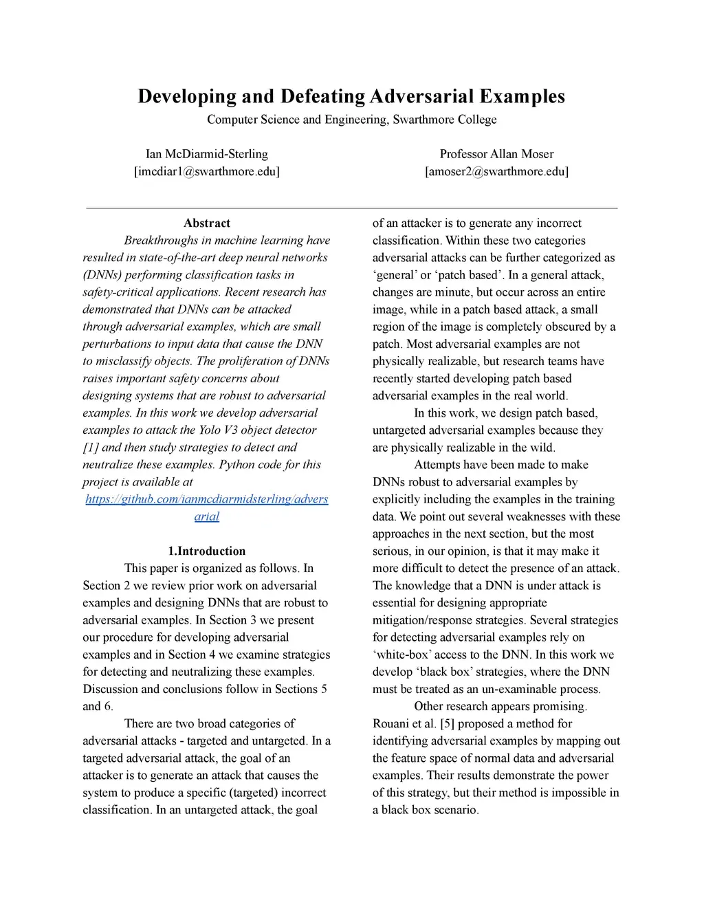 Breakthroughs in machine learning have resulted in state-of-the-art deep neural networks (DNNs) performing classification tasks in safety-critical applications. Recent research has demonstrated that DNNs can be attacked through adversarial examples, which are small perturbations to input data that cause the DNN to misclassify objects. The proliferation of DNNs raises important safety concerns about designing systems that are robust to adversarial examples. In this work we develop adversarial examples to attack the Yolo V3 object detector [1] and then study strategies to detect and neutralize these examples. Python code for this project is available at https://github.com/ianmcdiarmidsterling/adversarial