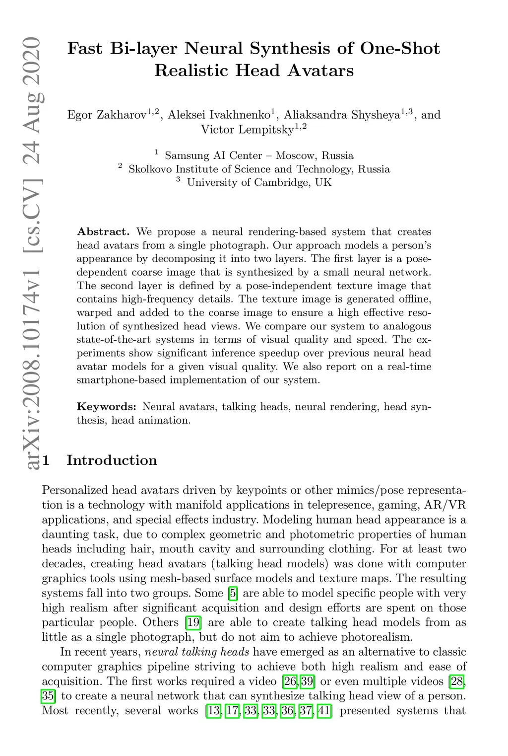 We propose a neural rendering-based system that creates head avatars from a single photograph. Our approach models a person's appearance by decomposing it into two layers. The first layer is a pose-dependent coarse image that is synthesized by a small neural network. The second layer is defined by a pose-independent texture image that contains high-frequency details. The texture image is generated offline, warped and added to the coarse image to ensure a high effective resolution of synthesized head views. We compare our system to analogous state-of-the-art systems in terms of visual quality and speed. The experiments show significant inference speedup over previous neural head avatar models for a given visual quality. We also report on a real-time smartphone-based implementation of our system.