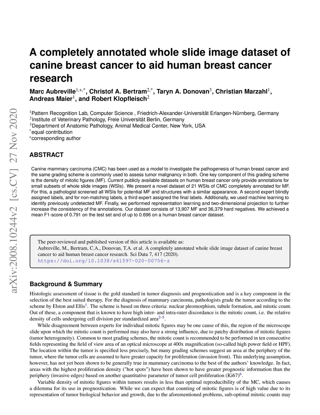 Canine mammary carcinoma (CMC) has been used as a model to investigate the pathogenesis of human breast cancer and the same grading scheme is commonly used to assess tumor malignancy in both. One key component of this grading scheme is the density of mitotic figures (MF). Current publicly available datasets on human breast cancer only provide annotations for small subsets of whole slide images (WSIs). We present a novel dataset of 21 WSIs of CMC completely annotated for MF. For this, a pathologist screened all WSIs for potential MF and structures with a similar appearance. A second expert blindly assigned labels, and for non-matching labels, a third expert assigned the final labels. Additionally, we used machine learning to identify previously undetected MF. Finally, we performed representation learning and two-dimensional projection to further increase the consistency of the annotations. Our dataset consists of 13,907 MF and 36,379 hard negatives. We achieved a mean F1-score of 0.791 on the test set and of up to 0.696 on a human breast cancer dataset.