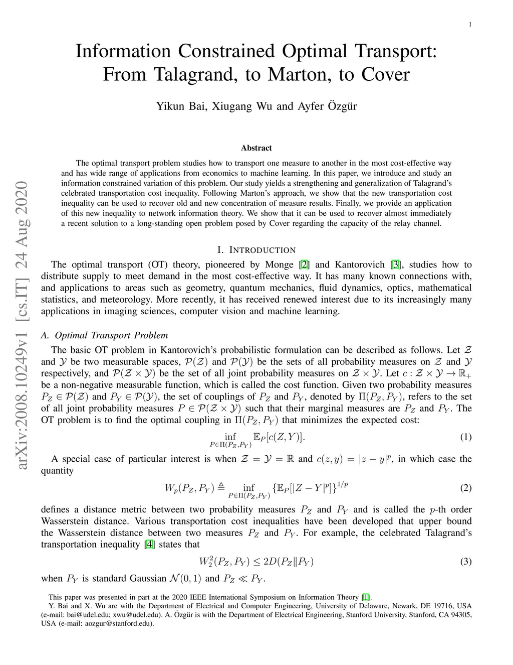 The optimal transport problem studies how to transport one measure to another in the most cost-effective way and has wide range of applications from economics to machine learning. In this paper, we introduce and study an information constrained variation of this problem. Our study yields a strengthening and generalization of Talagrand's celebrated transportation cost inequality. Following Marton's approach, we show that the new transportation cost inequality can be used to recover old and new concentration of measure results. Finally, we provide an application of this new inequality to network information theory. We show that it can be used to recover almost immediately a recent solution to a long-standing open problem posed by Cover regarding the capacity of the relay channel.