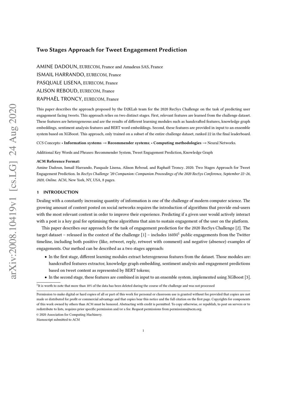 This paper describes the approach proposed by the D2KLab team for the 2020 RecSys Challenge on the task of predicting user engagement facing tweets. This approach relies on two distinct stages. First, relevant features are learned from the challenge dataset. These features are heterogeneous and are the results of different learning modules such as handcrafted features, knowledge graph embeddings, sentiment analysis features and BERT word embeddings. Second, these features are provided in input to an ensemble system based on XGBoost. This approach, only trained on a subset of the entire challenge dataset, ranked 22 in the final leaderboard.