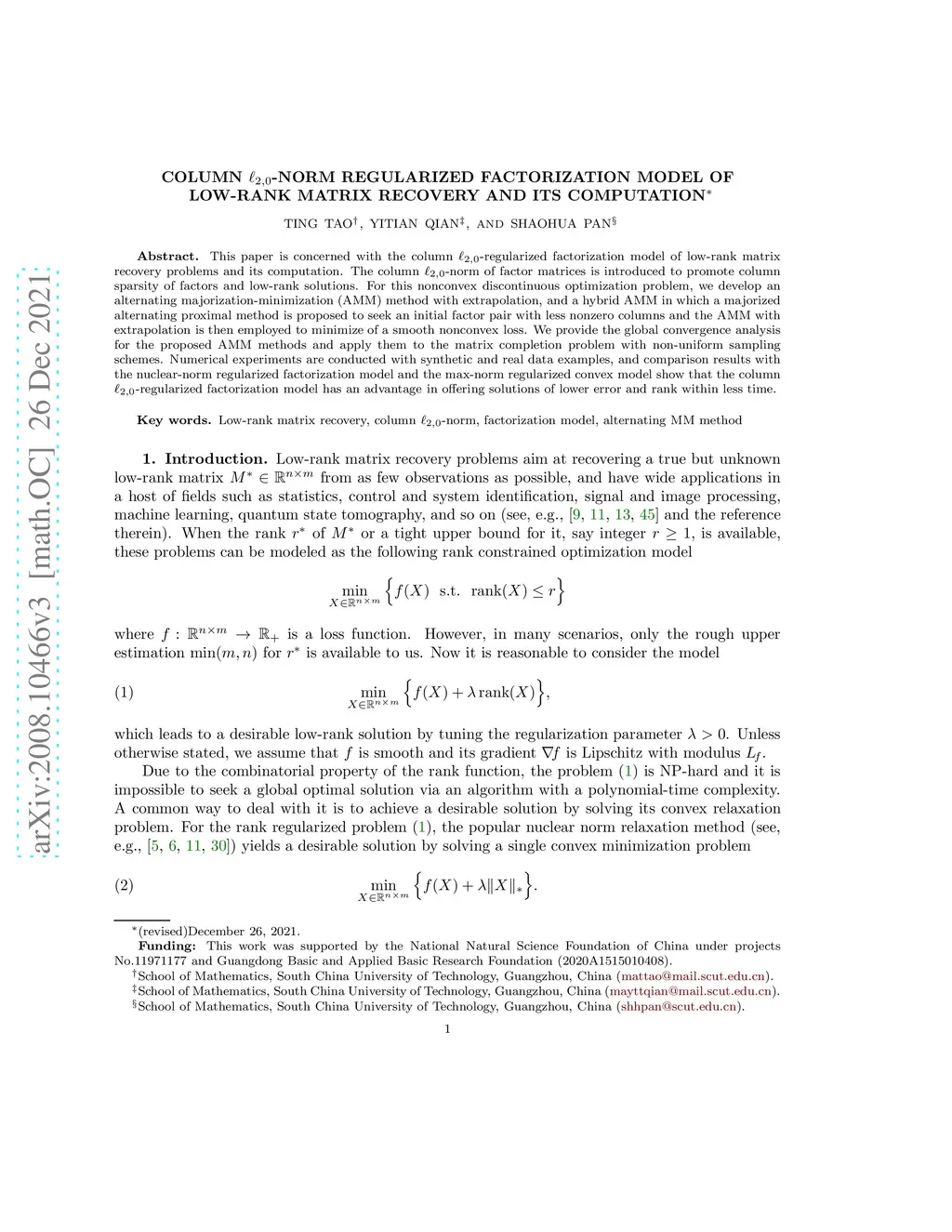 This paper is concerned with the column -regularized factorization model of low-rank matrix recovery problems and its computation. The column -norm of factor matrices is introduced to promote column sparsity of factors and low-rank solutions. For this nonconvex discontinuous optimization problem, we develop an alternating majorization-minimization (AMM) method with extrapolation, and a hybrid AMM in which a majorized alternating proximal method is proposed to seek an initial factor pair with less nonzero columns and the AMM with extrapolation is then employed to minimize of a smooth nonconvex loss. We provide the global convergence analysis for the proposed AMM methods and apply them to the matrix completion problem with non-uniform sampling schemes. Numerical experiments are conducted with synthetic and real data examples, and comparison results with the nuclear-norm regularized factorization model and the max-norm regularized convex model show that the column -regularized factorization model has an advantage in offering solutions of lower error and rank within less time.