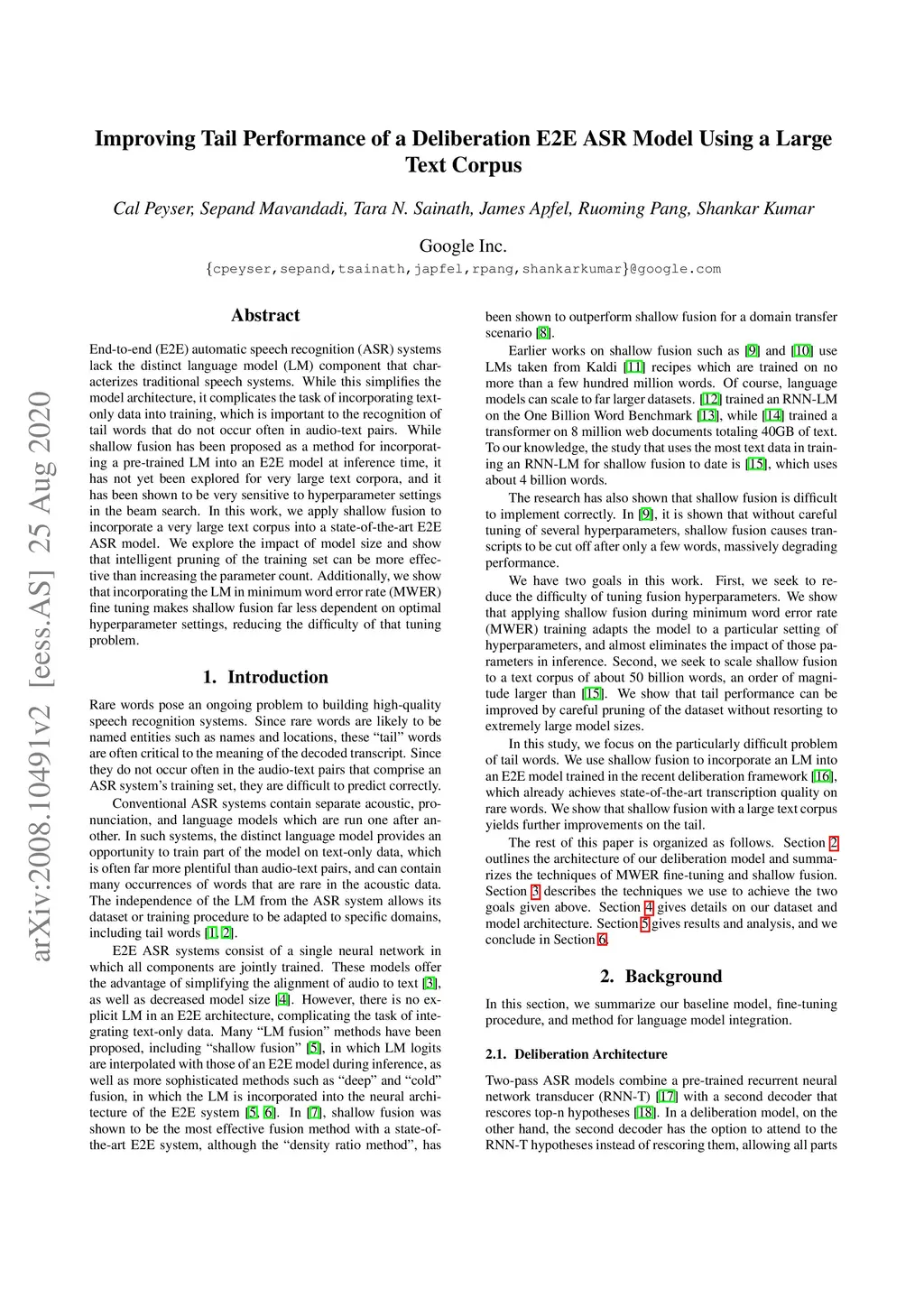 End-to-end (E2E) automatic speech recognition (ASR) systems lack the distinct language model (LM) component that characterizes traditional speech systems. While this simplifies the model architecture, it complicates the task of incorporating text-only data into training, which is important to the recognition of tail words that do not occur often in audio-text pairs. While shallow fusion has been proposed as a method for incorporating a pre-trained LM into an E2E model at inference time, it has not yet been explored for very large text corpora, and it has been shown to be very sensitive to hyperparameter settings in the beam search. In this work, we apply shallow fusion to incorporate a very large text corpus into a state-of-the-art E2EASR model. We explore the impact of model size and show that intelligent pruning of the training set can be more effective than increasing the parameter count. Additionally, we show that incorporating the LM in minimum word error rate (MWER) fine tuning makes shallow fusion far less dependent on optimal hyperparameter settings, reducing the difficulty of that tuning problem.