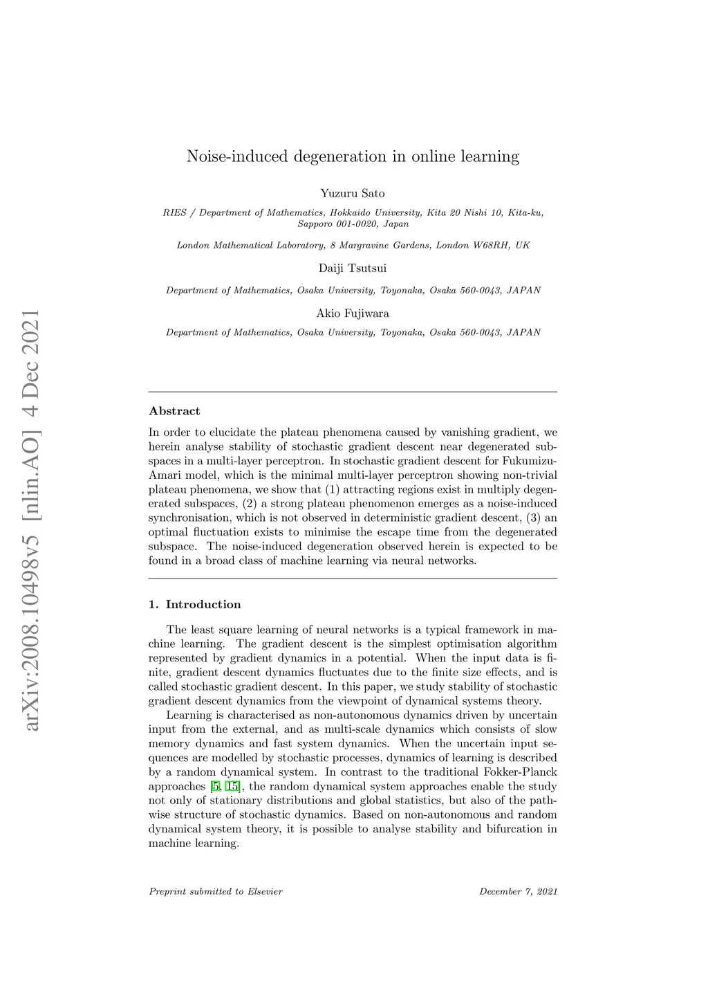 In order to elucidate the plateau phenomena caused by vanishing gradient, we herein analyse stability of stochastic gradient descent near degenerated subspaces in a multi-layer perceptron. In stochastic gradient descent for Fukumizu-Amari model, which is the minimal multi-layer perceptron showing non-trivial plateau phenomena, we show that (1) attracting regions exist in multiply degenerated subspaces, (2) a strong plateau phenomenon emerges as a noise-induced synchronisation, which is not observed in deterministic gradient descent, (3) an optimal fluctuation exists to minimise the escape time from the degenerated subspace. The noise-induced degeneration observed herein is expected to be found in a broad class of machine learning via neural networks.