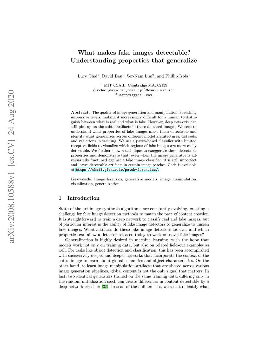 The quality of image generation and manipulation is reaching impressive levels, making it increasingly difficult for a human to distinguish between what is real and what is fake. However, deep networks can still pick up on the subtle artifacts in these doctored images. We seek to understand what properties of fake images make them detectable and identify what generalizes across different model architectures, datasets, and variations in training. We use a patch-based classifier with limited receptive fields to visualize which regions of fake images are more easily detectable. We further show a technique to exaggerate these detectable properties and demonstrate that, even when the image generator is adversarially finetuned against a fake image classifier, it is still imperfect and leaves detectable artifacts in certain image patches. Code is available at https://chail.github.io/patch-forensics/.