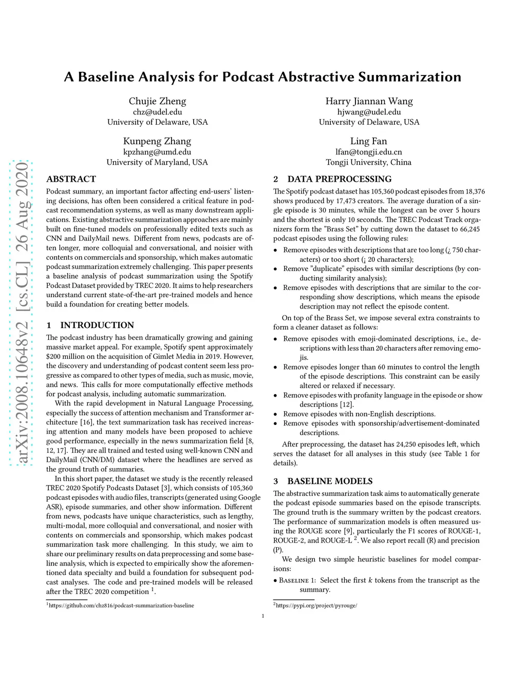Podcast summary, an important factor affecting end-users' listening decisions, has often been considered a critical feature in podcast recommendation systems, as well as many downstream applications. Existing abstractive summarization approaches are mainly built on fine-tuned models on professionally edited texts such as CNN and DailyMail news. Different from news, podcasts are often longer, more colloquial and conversational, and noisier with contents on commercials and sponsorship, which makes automatic podcast summarization extremely challenging. This paper presents a baseline analysis of podcast summarization using the Spotify Podcast Dataset provided by TREC 2020. It aims to help researchers understand current state-of-the-art pre-trained models and hence build a foundation for creating better models.