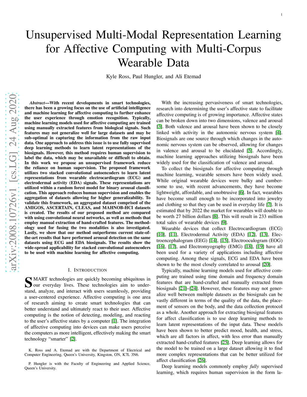 With recent developments in smart technologies, there has been a growing focus on the use of artificial intelligence and machine learning for affective computing to further enhance the user experience through emotion recognition. Typically, machine learning models used for affective computing are trained using manually extracted features from biological signals. Such features may not generalize well for large datasets and may be sub-optimal in capturing the information from the raw input data. One approach to address this issue is to use fully supervised deep learning methods to learn latent representations of the biosignals. However, this method requires human supervision to label the data, which may be unavailable or difficult to obtain. In this work we propose an unsupervised framework reduce the reliance on human supervision. The proposed framework utilizes two stacked convolutional autoencoders to learn latent representations from wearable electrocardiogram (ECG) and electrodermal activity (EDA) signals. These representations are utilized within a random forest model for binary arousal classification. This approach reduces human supervision and enables the aggregation of datasets allowing for higher generalizability. To validate this framework, an aggregated dataset comprised of the AMIGOS, ASCERTAIN, CLEAS, and MAHNOB-HCI datasets is created. The results of our proposed method are compared with using convolutional neural networks, as well as methods that employ manual extraction of hand-crafted features. The methodology used for fusing the two modalities is also investigated. Lastly, we show that our method outperforms current state-of-the-art results that have performed arousal detection on the same datasets using ECG and EDA biosignals. The results show the wide-spread applicability for stacked convolutional autoencoders to be used with machine learning for affective computing.