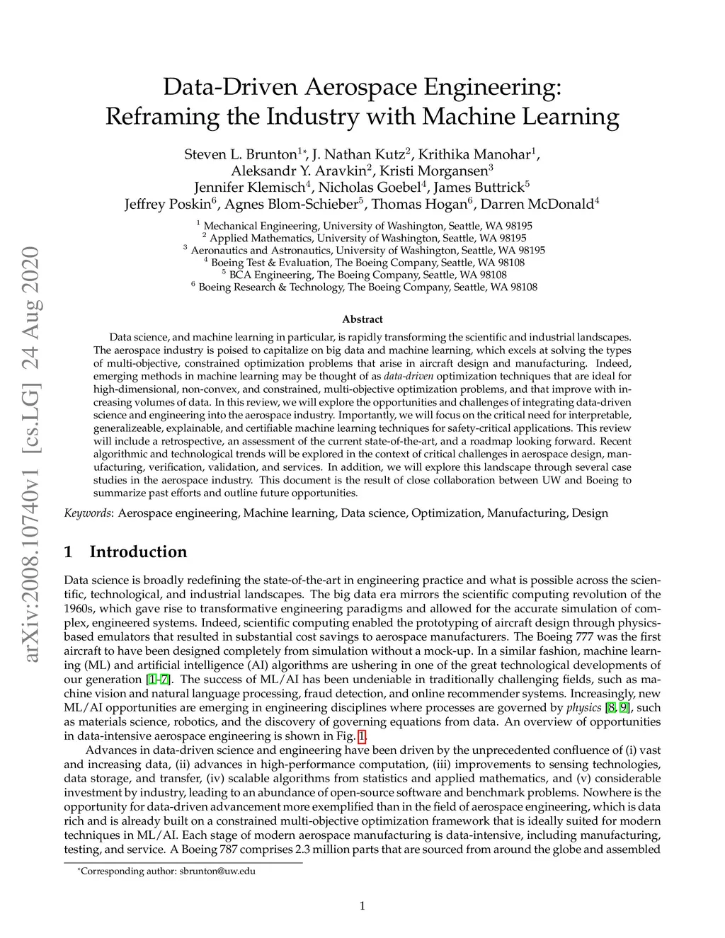 Data science, and machine learning in particular, is rapidly transforming the scientific and industrial landscapes. The aerospace industry is poised to capitalize on big data and machine learning, which excels at solving the types of multi-objective, constrained optimization problems that arise in aircraft design and manufacturing. Indeed, emerging methods in machine learning may be thought of as data-driven optimization techniques that are ideal for high-dimensional, non-convex, and constrained, multi-objective optimization problems, and that improve with increasing volumes of data. In this review, we will explore the opportunities and challenges of integrating data-driven science and engineering into the aerospace industry. Importantly, we will focus on the critical need for interpretable, generalizeable, explainable, and certifiable machine learning techniques for safety-critical applications. This review will include a retrospective, an assessment of the current state-of-the-art, and a roadmap looking forward. Recent algorithmic and technological trends will be explored in the context of critical challenges in aerospace design, manufacturing, verification, validation, and services. In addition, we will explore this landscape through several case studies in the aerospace industry. This document is the result of close collaboration between UW and Boeing to summarize past efforts and outline future opportunities.